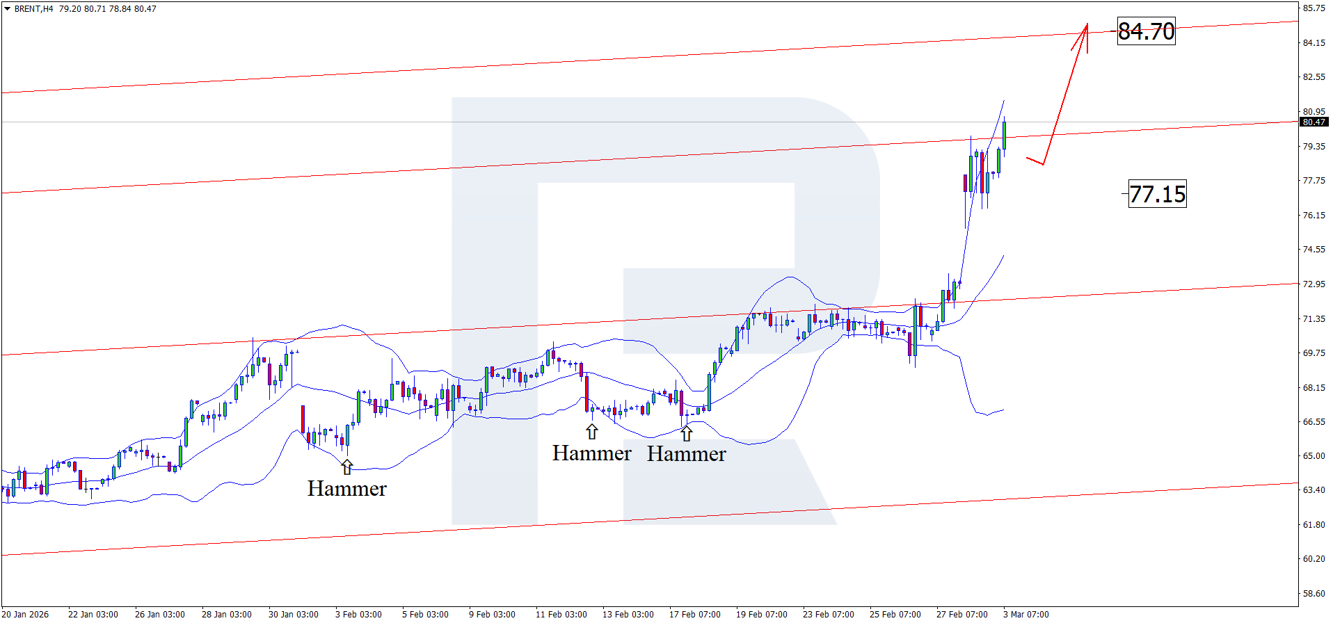 H4 grafikda Brent kotirovkalari pastki Bollinger Band sinovidan so‘ng Hammer qaytish modelini shakllantirdi va signalga muvofiq o‘sish impulsini davom ettirmoqda.
