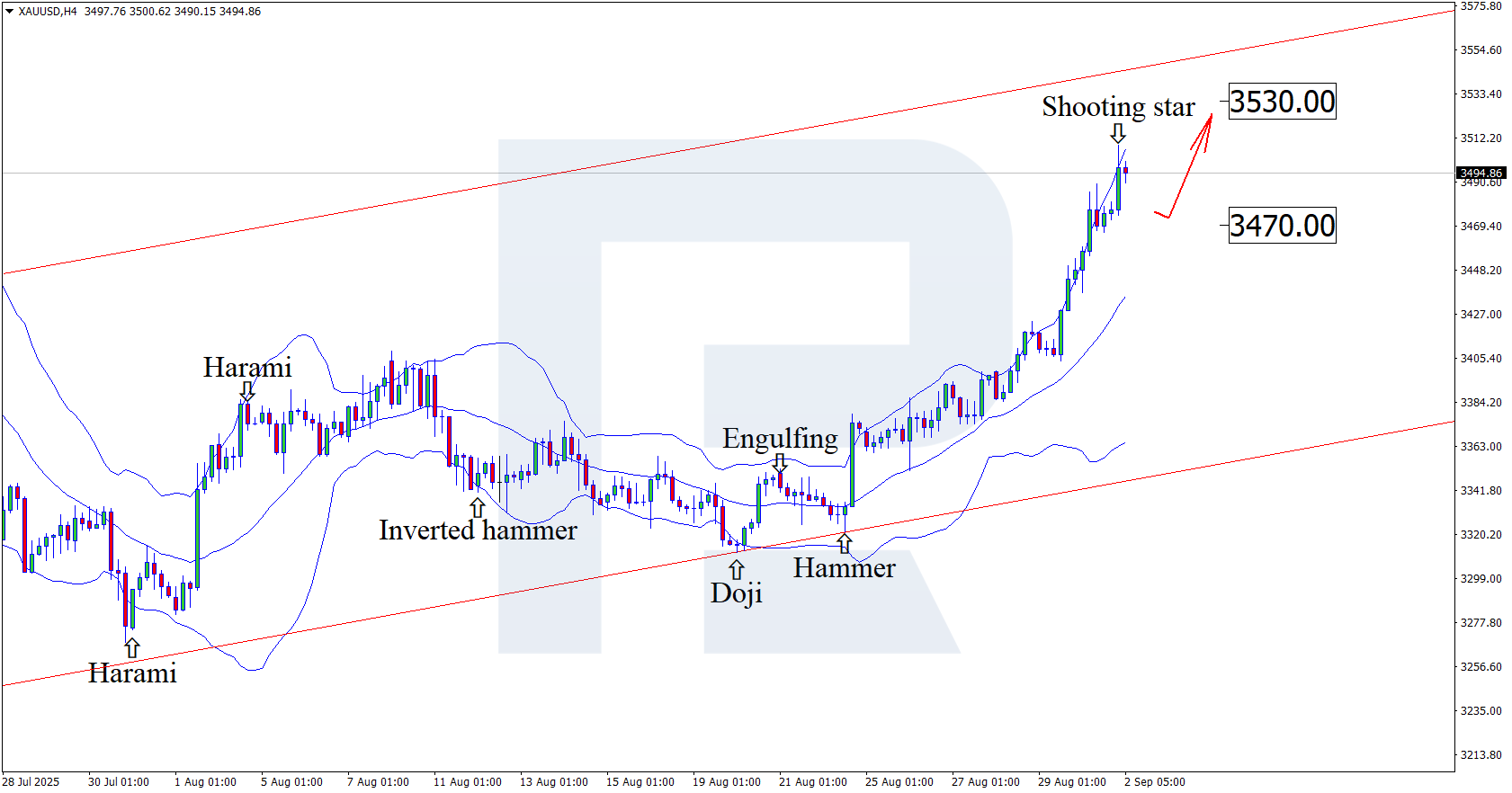 H4 grafikda XAUUSD kotirovkalari yuqori Bollinger Band yaqinida Shooting Star reversal naqshini hosil qildi. Ushbu signalga muvofiq bozor korreksion to‘lqin shakllantirishi mumkin. Shunga qaramay, XAUUSD narxlari ko‘tariluvchi kanalda qolmoqda, kengroq istiqbolda “buqa” momentumi saqlanib turibdi. Eng yaqin korreksiya maqsadi 3,470 USD bo‘lishi mumkin.
