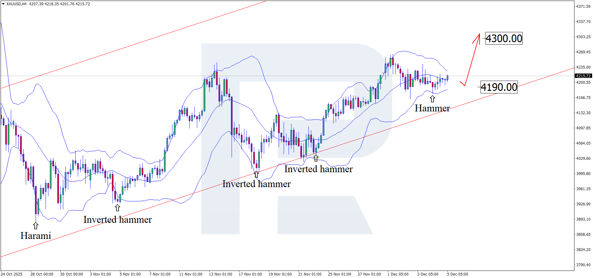 H4 grafikda XAUUSD narxlari pastki Bollinger Band yaqinida Hammer (Bolg‘a) qaytish modelini shakllantirdi. Hozirgi bosqichda narxlar ushbu modelning tasdig‘i asosida o‘sishni davom ettirishi mumkin. XAUUSD kotirovkalari hali ham yuqoriga yo‘nalgan kanal ichida bo‘lib, navbatdagi maqsad daraja 4 300 dollar bo‘lishi mumkin.