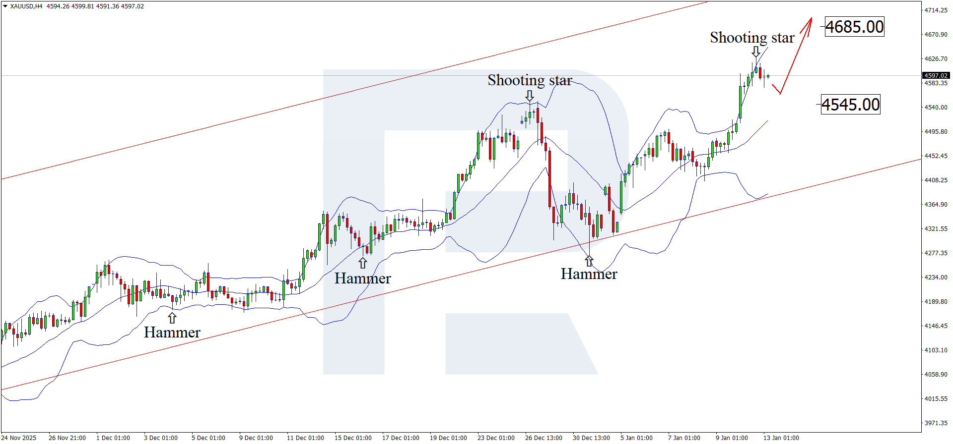 13 January 2026 uchun XAUUSD prognozi to‘liq oltin foydasiga qolmoqda. Texnik tahlil tuzatish bosqichi yakunlangach, narxlarning yana o‘sishini ko‘rsatmoqda.