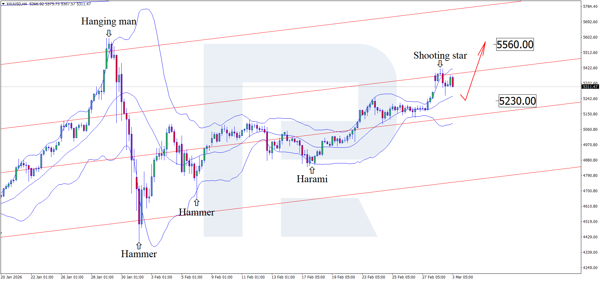 H4 grafikda XAUUSD kotirovkalari yuqori Bollinger Band yaqinida Shooting Star qaytish modelini shakllantirdi. Hozirgi bosqichda narxlar tuzatish to‘lqinini davom ettirmoqda va model amalga oshishi jarayonida qisqa muddatli qaytish kuzatilishi mumkin. XAUUSD ko‘tariluvchi kanal ichida qolayotganligi sababli, birinchi tuzatish maqsadi 5,230 USD darajasida joylashgan.