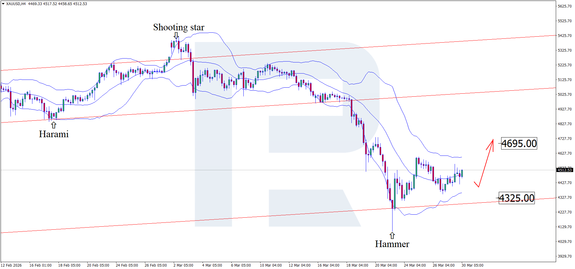 H4 grafikda XAUUSD narxlari pastki Bollinger Band yaqinida Hammer qaytish modelini shakllantirdi va model signali ortidan yuqoriga harakatni davom ettirishi mumkin. XAUUSD kotirovkalari o‘suvchi kanal ichida qolayotgani sabab, 4,695 USD darajasi o‘sish maqsadi bo‘lib xizmat qilishi mumkin.