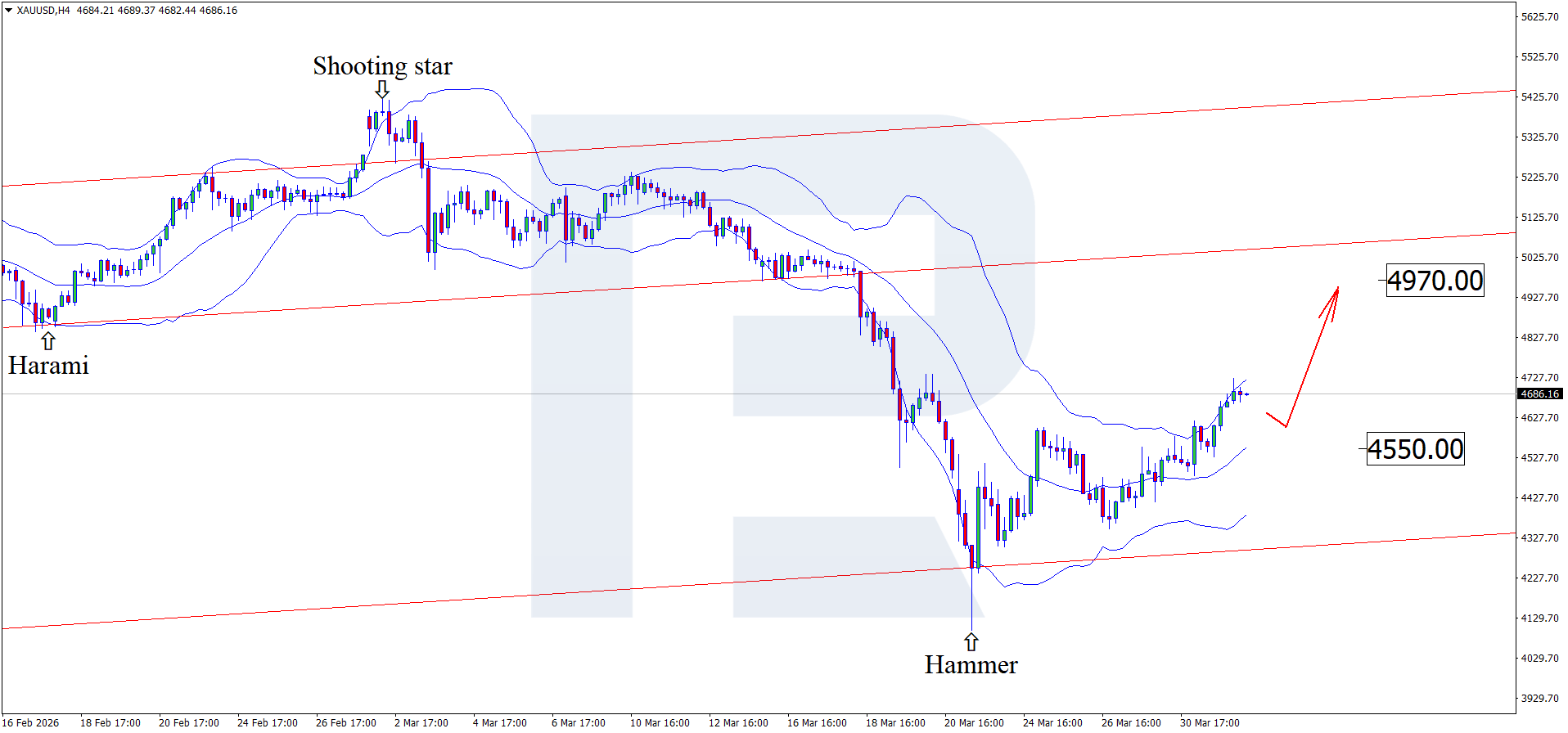 H4 grafikda XAUUSD pastki Bollinger Band yaqinida Hammer qaytish patternini hosil qildi. Ushbu pattern signali doirasida kotirovkalar o‘sish to‘lqinini davom ettirmoqda. XAUUSD narxi o‘suvchi kanal chegaralarida qolayotgan ekan, 4,970 USD darajasi yuqoriga maqsad bo‘lib xizmat qilishi mumkin.