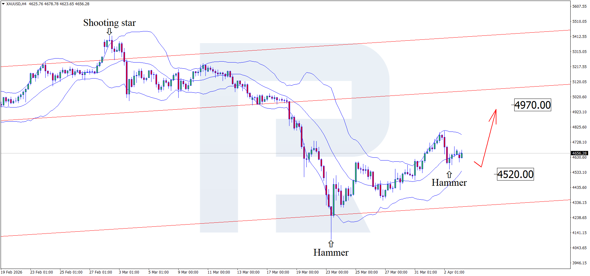 H4 grafikda XAUUSD narxlari o‘rta Bollinger Band yaqinida Hammer qayrilish naqshini hosil qildi. Ushbu naqsh signali ortidan kotirovkalar o‘sish to‘lqinini shakllantirmoqda. Narxlar o‘suvchi kanal ichida qolayotganligi sababli, 4,970 USD darajasi yuqoridagi maqsad bo‘lishi mumkin.