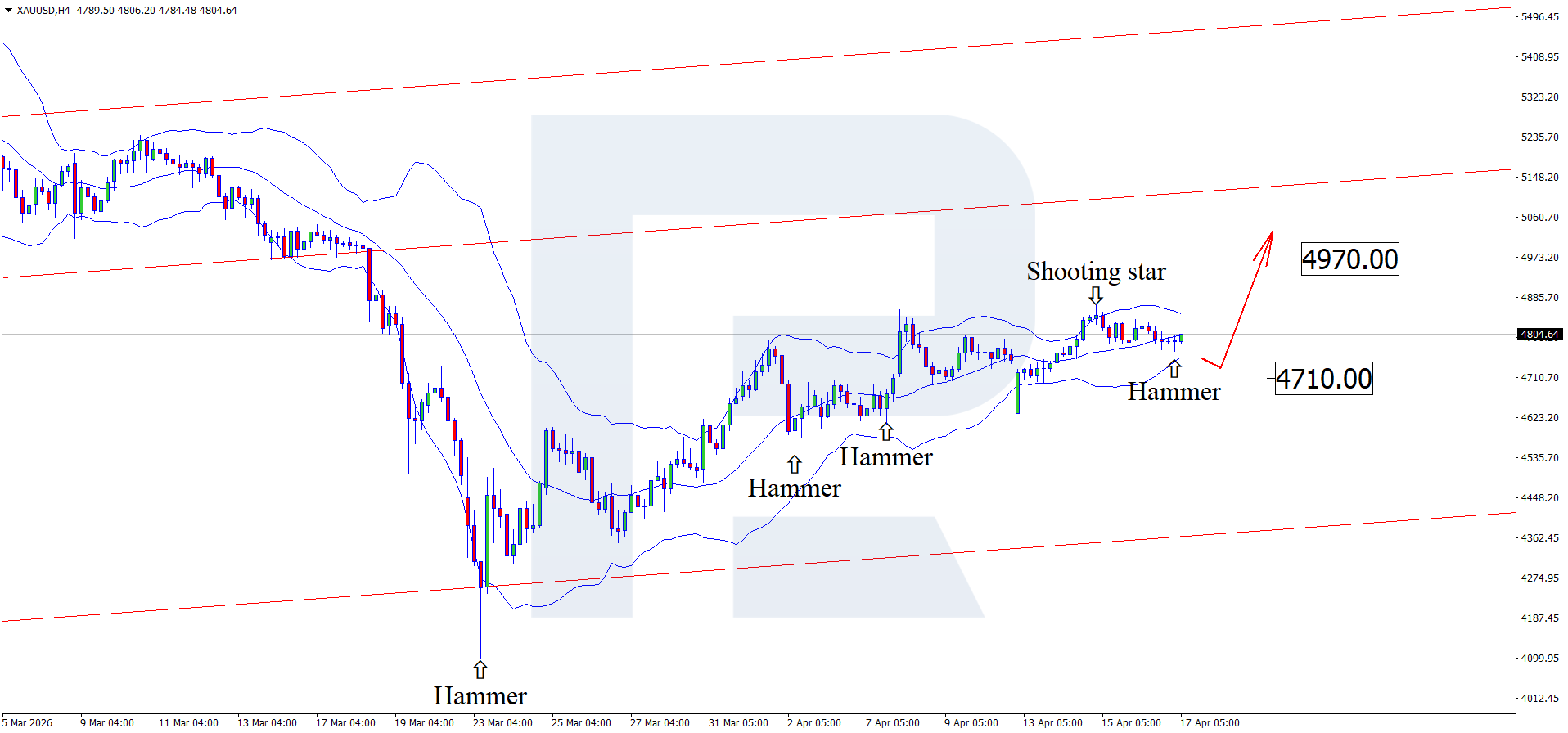 H4 grafikda XAUUSD narxlari Bollinger Bands’ning o‘rta chizig‘i yaqinida “Hammer” qayrilish naqshini shakllantirdi. Naqsh signali ishlashi jarayonida kotirovkalar yuqoriga to‘lqin hosil qilishi mumkin. XAUUSD narxlari o‘suvchi kanal ichida qolayotganligi sababli, 4,970 USD qarshilik darajasi yuqori maqsad bo‘lib xizmat qilishi mumkin.