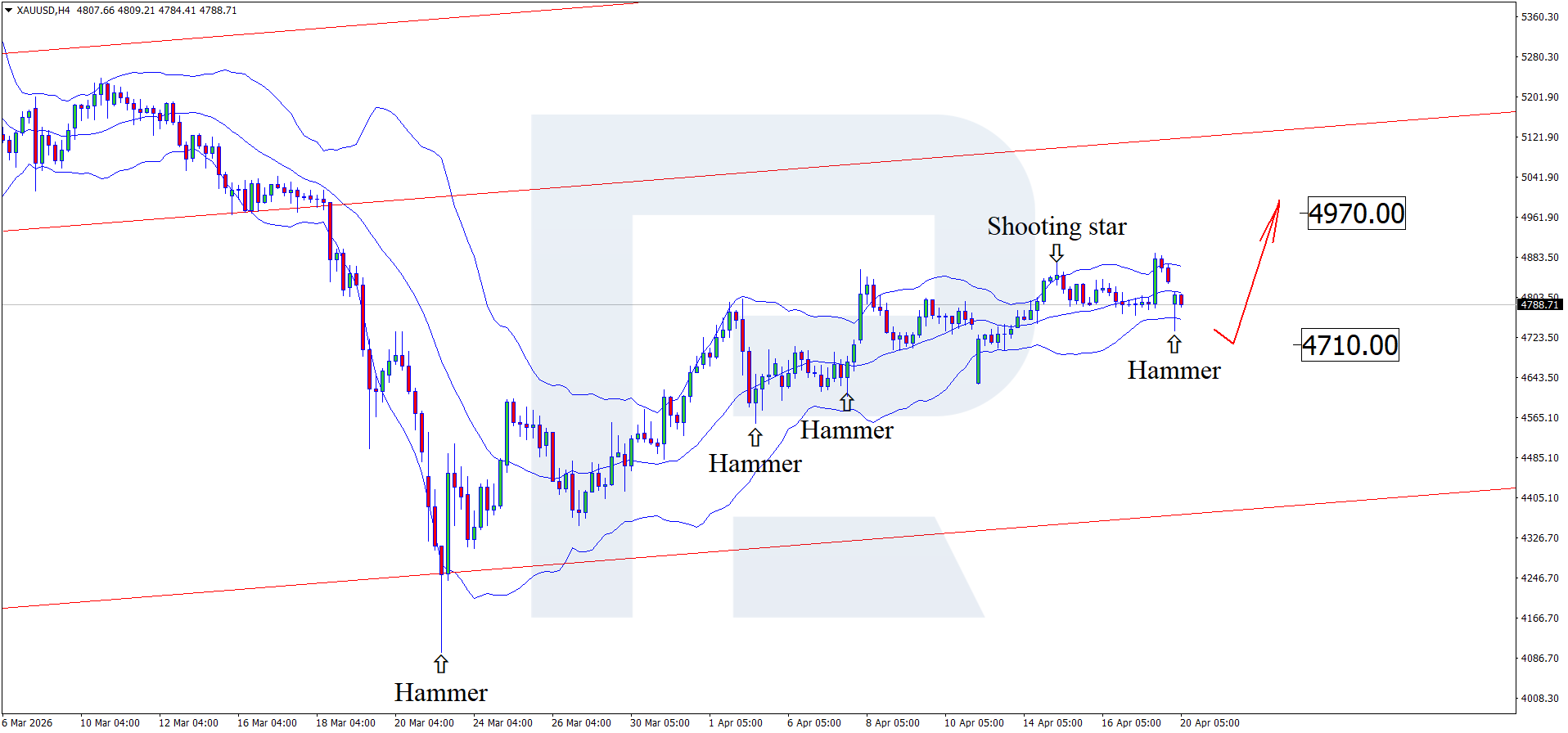 H4 grafikda XAUUSD pastki Bollinger Band yaqinida Hammer qayrilish patternini shakllantirdi. Ushbu signal ishlashi bilan kotirovkalar yuqoriga to‘lqin hosil qilib, gapni yopishga urinishi mumkin. XAUUSD narxi o‘suvchi kanal ichida qolayotgan ekan, 4,970 USD qarshilik darajasi yuqoriga maqsad bo‘lib xizmat qilishi mumkin.