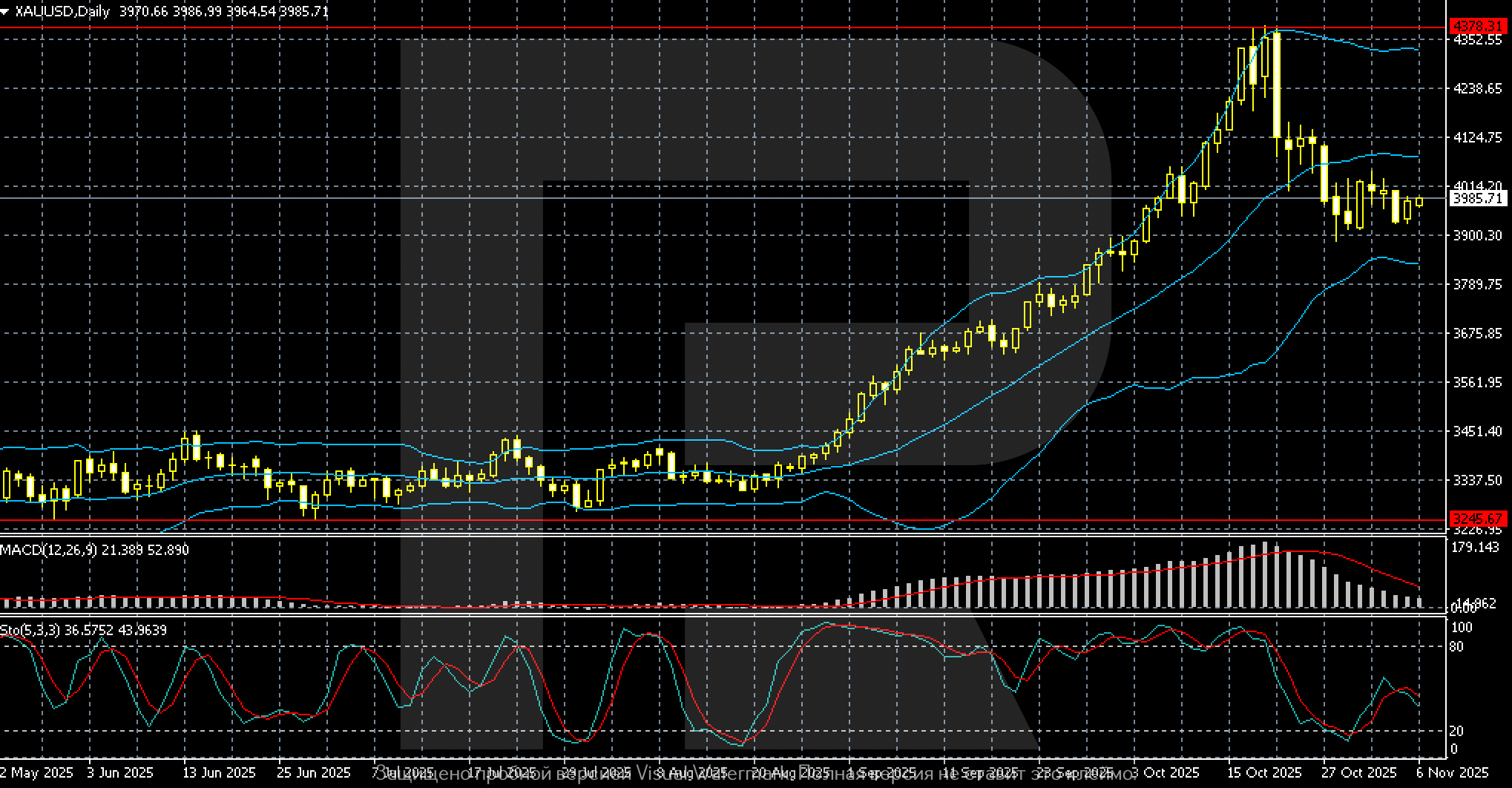 Kundalik grafikda oltin (XAUUSD) oktyabr o‘rtalarida 4,378 darajasidagi rekord cho‘qqidan keyin tuzatish bosqichida savdolanmoqda. Foyda olish va volatillikning pasayishidan so‘ng narxlar asosiy 3,900 qo‘llab-quvvatlash darajasi ustida ushlab turilib, sotuvdan keyin barqarorlashuvni ko‘rsatmoqda.