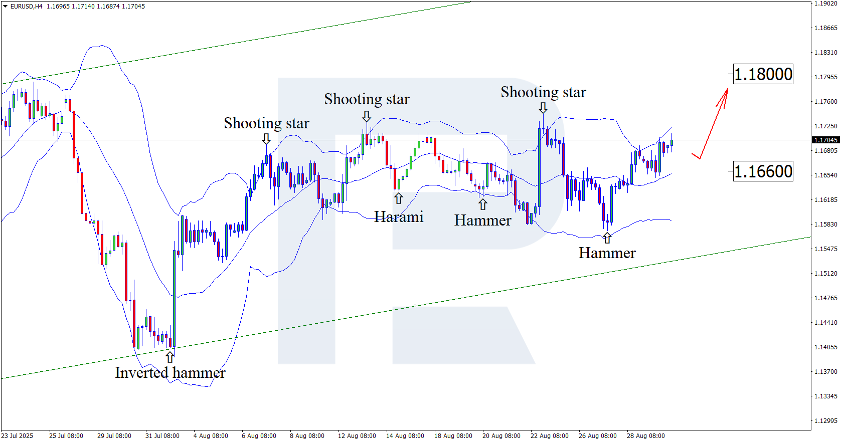 H4 grafikda EURUSD juftligi o‘rta Bollinger Band yaqinida Hammer reversal shaklini hosil qildi. Hozirda juftlik ushbu signalga muvofiq yuqoriga to‘lqin hosil qilishda davom etmoqda. Yevrozonadan olingan fundamental ma’lumotlarni hisobga olib, kotirovkalar eng yaqin qarshilik darajasi 1.1800 tomon harakatlanishi mumkin. Ushbu darajadan yuqoriga breakout yangi “buqa” trendiga yo‘l ochadi.