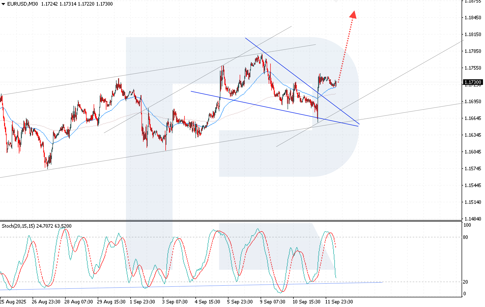Bugungi EURUSD prognozi bullish ssenariy davom etishini va yevroning yana mustahkamlanishini ko‘rsatmoqda, shu bilan birga lokal qo‘llab-quvvatlash darajasi 1.1690 atrofida shakllanmoqda. Stoxastik osillatordan buy signali paydo bo‘lgan: uning chiziqlari oversold hududidan yuqoriga burildi va bullish momentum davom etishini tasdiqlamoqda.
