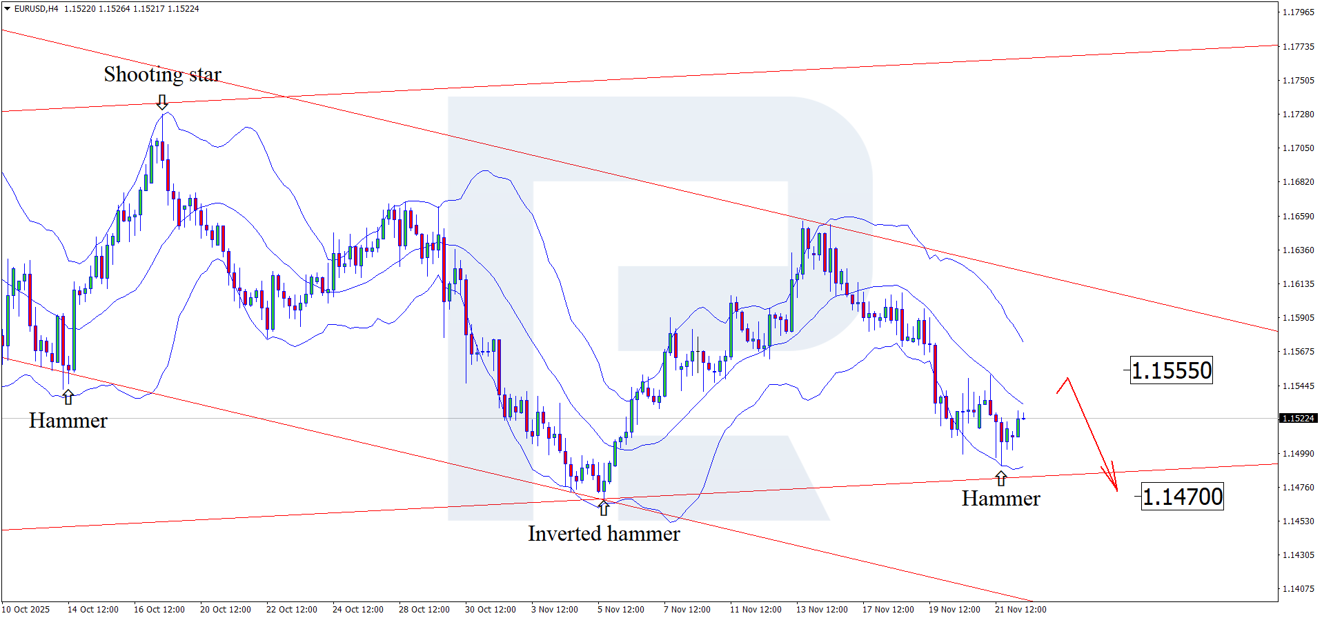 H4 grafikda EURUSD juftligi pastki Bollinger Band yaqinida Hammer qaytish modelini shakllantirgan. Ushbu bosqichda juftlik ushbu signal ortidan korreksion to‘lqin shakllantirishi mumkin. Kotirovkalar pasayuvchi kanal ichida bo‘lib turganligi sababli, 1.1555 tomonga ko‘tarilish ehtimoli mavjud. Ushbu darajadan qaytish esa pasayish trendining qayta tiklanishiga yo‘l ochadi.