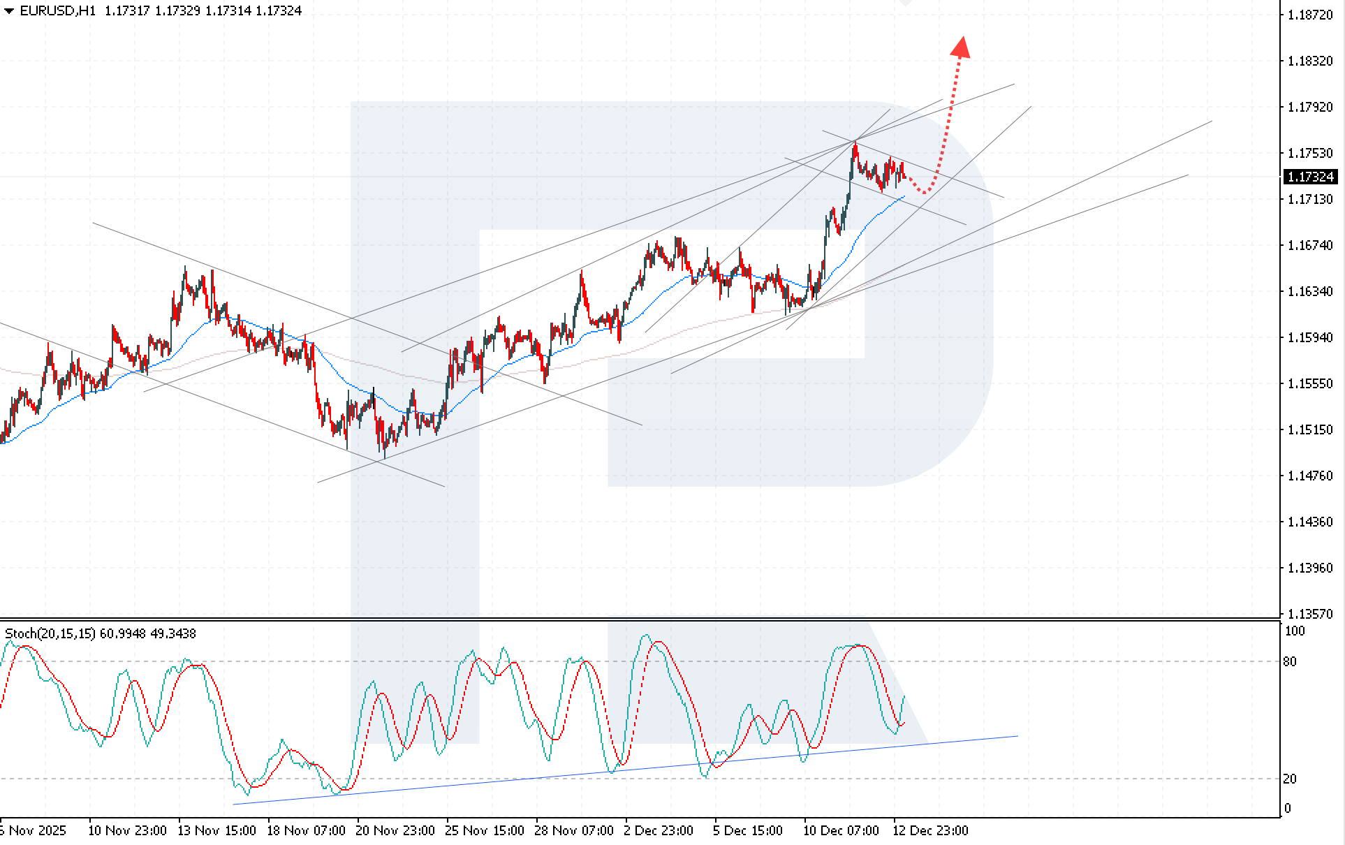 EURUSD juftligi bullish impuls va AQSh pul-kredit siyosati atrofidagi noaniqliklar uyg‘unligi fonida o‘sishda davom etmoqda. Joriy kotirovka 1.1732 darajasida. Batafsil — 2025 yil 15 dekabr uchun tahlilimizda.