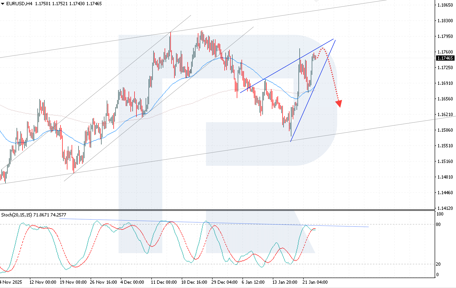 Bugungi EURUSD prognozi burilish modeli rivojlanishi fonida 1.1645 darajasiga tomon pasayishni nazarda tutadi. Joriy texnik manzara sotuv bosimi kuchayib borayotganini ko‘rsatmoqda. Stochastic Oscillator ham bearish ssenariyni tasdiqlaydi: uning signal chiziqlari haddan tashqari xarid qilingan hududga yaqinlashib, bearish kesishishni hosil qildi, bu esa tuzatuvchi pasayish ehtimolini oshiradi.