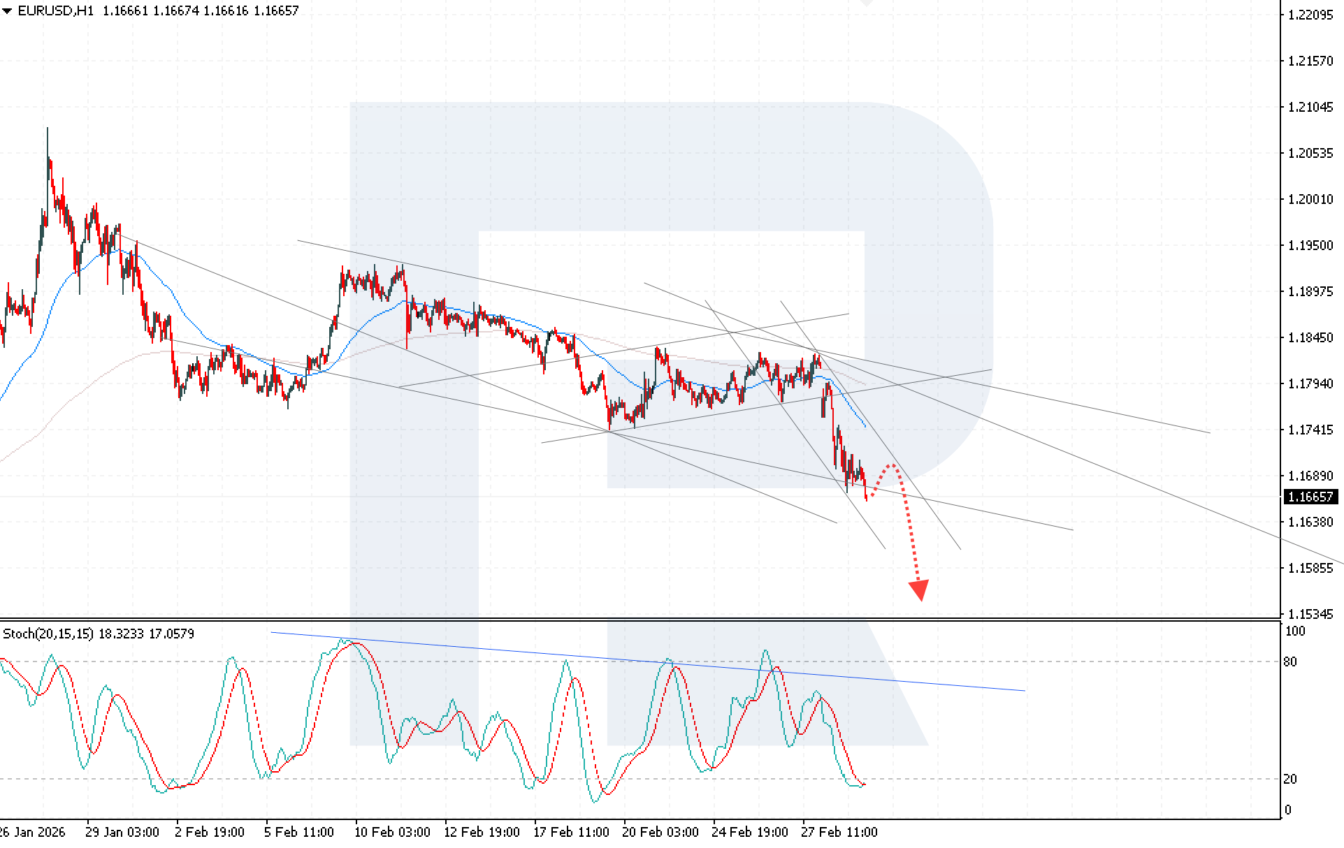 Bugungi EURUSD prognozi 1.1555 tomon keyingi pasayishni nazarda tutadi. Undan oldin pasayuvchi kanalning yuqori chegarasiga tomon kichik tuzatish ehtimoli mavjud, shundan so‘ng sotuvchilar yana impulsni qo‘lga olishi mumkin. Texnik manzara pasayuvchi bo‘lib qolmoqda. Stochastic Oscillator sotuv bosimining kuchayganini tasdiqlamoqda. Shu bilan birga, indikator allaqachon haddan tashqari sotilgan hududda, bu pasayishdan oldin qisqa muddatli tuzatish ehtimoli yuqoriligini bildiradi.