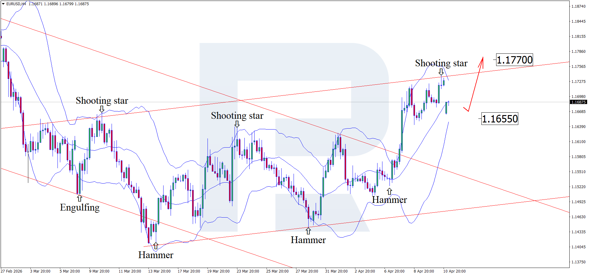 H4 grafikda EURUSD yuqori Bollinger chizig‘i yaqinida “Shooting Star” qayrilish patternini shakllantirdi. Sessiya narx gap bilan ochildi va pattern ishlayotgan sari kotirovkalar tuzatish to‘lqinini davom ettirmoqda. Narx o‘suvchi kanal ichida qolayotganini inobatga olsak, pasayishdagi maqsad 1.1655 atrofidagi qo‘llab-quvvatlash bo‘lishi mumkin. Agar narx shu darajadan qaytsa, o‘suvchi trend qayta davom etishi ehtimoli bor.