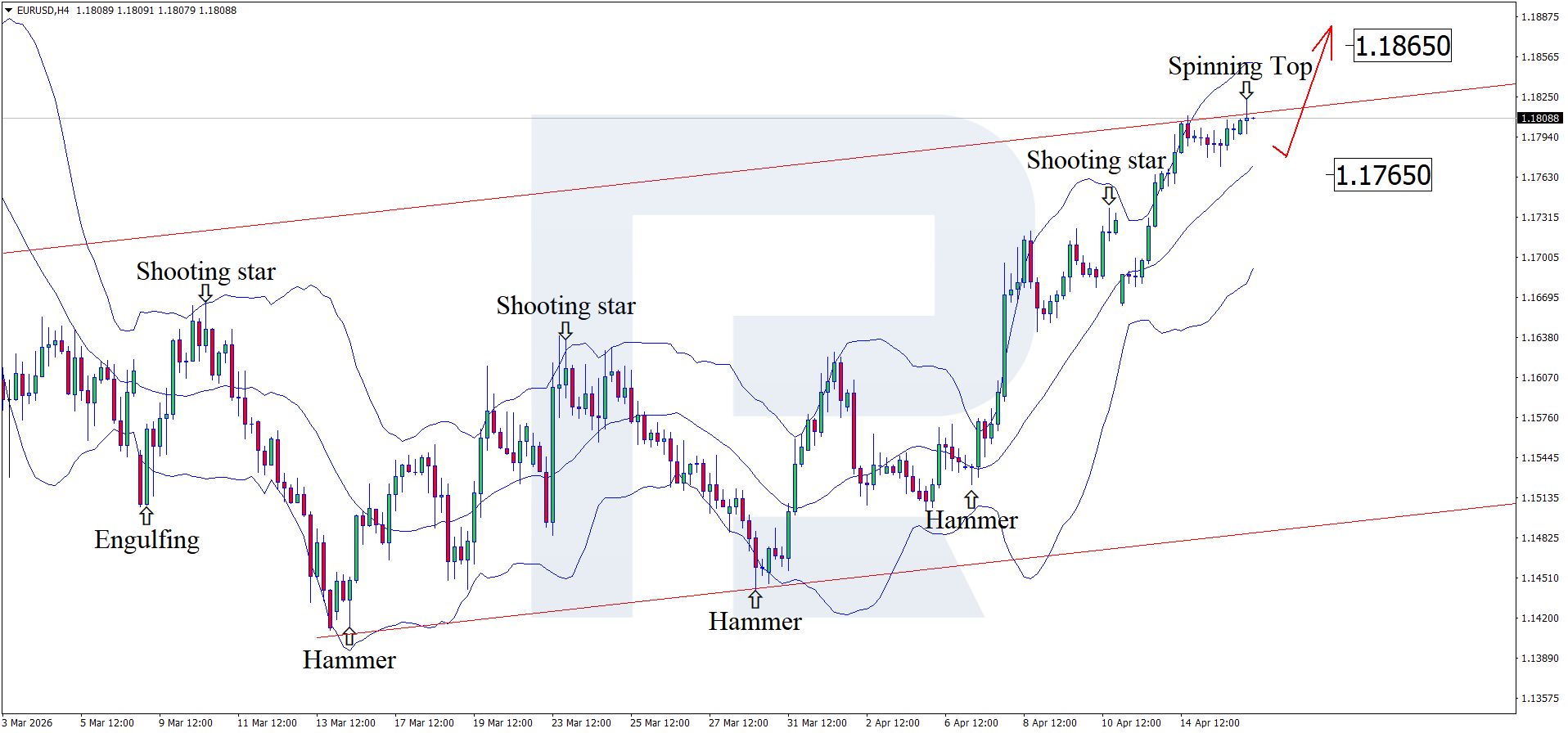 H4 grafikda EURUSD juftligi yuqori Bollinger Band yaqinida Spinning Top qayrilish naqshini hosil qildi. Ushbu signal asosida kotirovkalar korreksion to‘lqin shakllantirishi mumkin. Narxlar o‘suvchi kanal ichida qolayotgani sabab, 1.1765 qo‘llab-quvvatlash darajasi “otkat” maqsadi bo‘lib xizmat qilishi mumkin. Shu darajadan qaytish uptrendning davom etishiga yo‘l ochadi.
