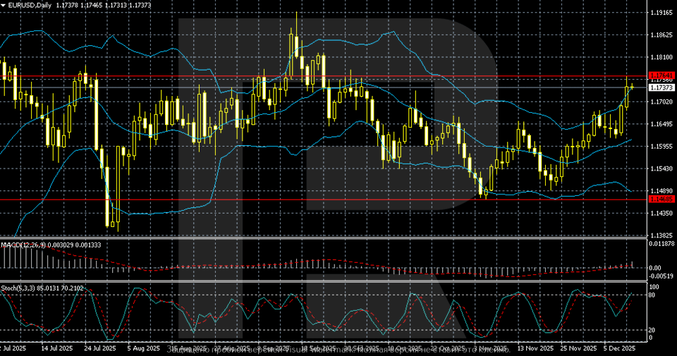 EURUSD juftligi haftani 1.1700 darajasiga yaqin yakunladi va AQSh dollariga bo‘lgan bosim davom etar ekan, oktyabr oyidagi yangi maksimumlarga chiqdi. USD ning zaiflashuvi Federal Rezervning dekabrdagi qarori va Jerom Pauell tomonidan kutilganidan ham yumshoqroq (dovish) signallar berilishi ortidan yuz berdi: foiz stavkasini oshirish masalasi kun tartibidan chiqarildi, Fed prognozlarida esa 2026 yilda atigi bitta pasaytirish ko‘zda tutilgan.