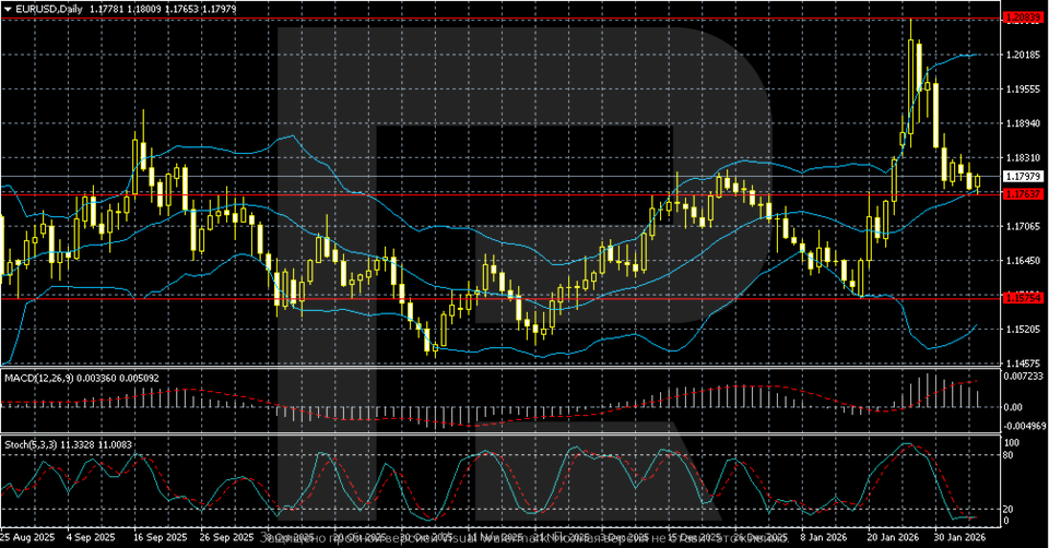 Texnik jihatdan, EURUSD juftligi ko‘tariluvchi trend doirasida korreksiya bosqichida qolmoqda. Yanvar oyidagi 1.2000–1.2050 gacha bo‘lgan o‘sishdan so‘ng, juftlik 1.1760–1.1800 zonasida konsolidatsiyalanmoqda — bu muhim qo‘llab-quvvatlash hududi. Narx Bollinger Bands o‘rta chizig‘i yaqinida ushlanib turibdi, volatillik pasaymoqda. MACD ijobiy hududda, Stochastic Oscillator esa trendni o‘zgartirmasdan pauzani tasdiqlamoqda.