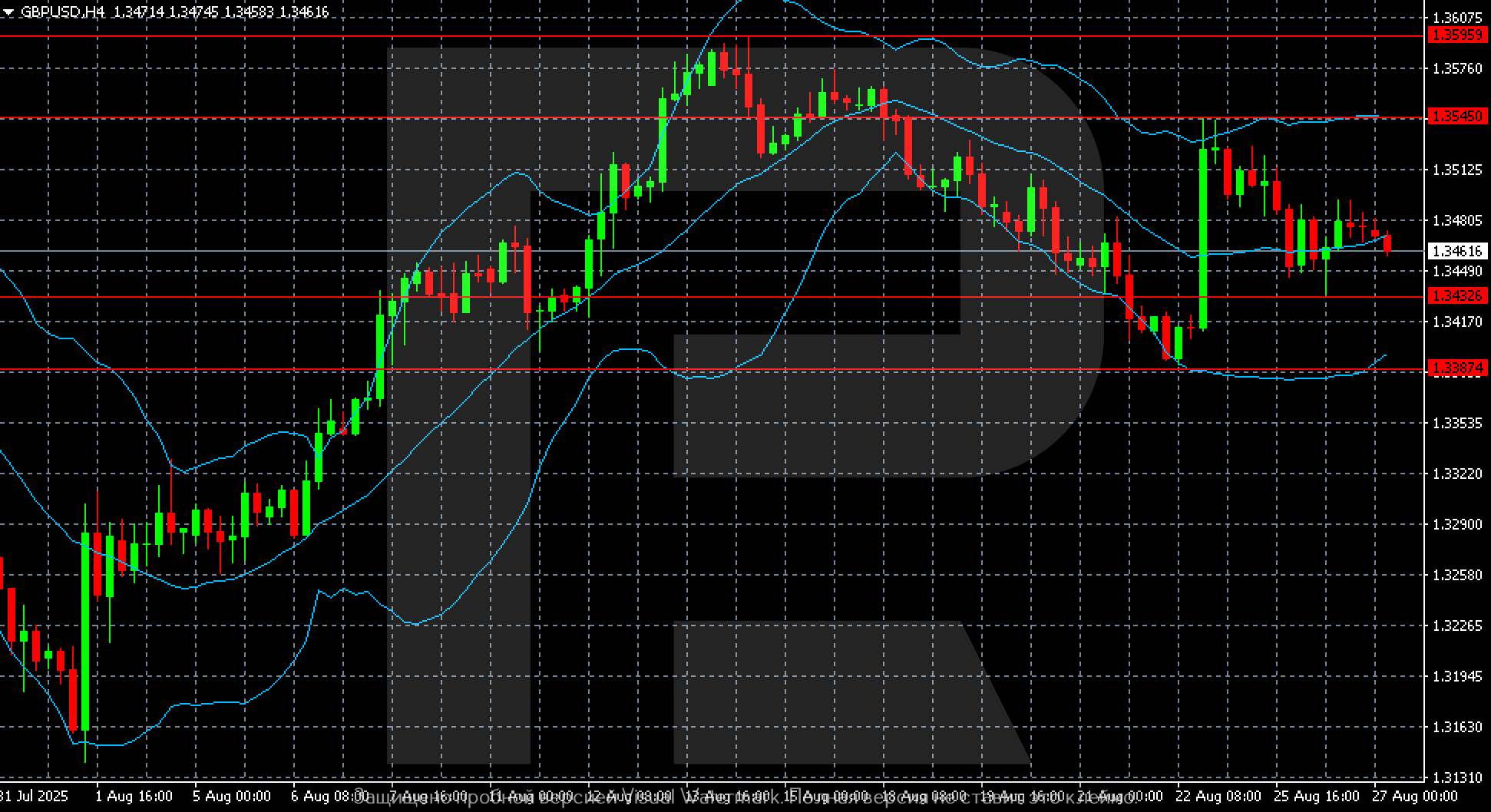 H4 grafikda GBPUSD juftligi avgust boshidagi o‘sishidan so‘ng tuzatishda ko‘rinmoqda. Oy boshida funt kuchli o‘sib, bir nechta qarshilik darajalaridan yuqoriga chiqdi va 1.3545–1.3560 oralig‘iga yetdi. Biroq, impuls so‘nib, juftlik pastga qarab fazaga o‘tdi va 1.3432 qo‘llab-quvvatlash darajasiga tuzatdi. Pasayish 1.3387 da to‘xtadi va shu yerdan mahalliy qaytish boshlandi.