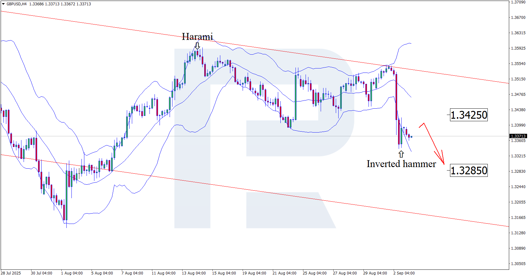 H4 grafikda GBPUSD juftligi quyi Bollinger Band’ni test qildi va Inverted Hammer reversal naqshini shakllantirdi. Hozirgi bosqichda juftlik ushbu signalga muvofiq korreksion to‘lqinni rivojlantirishi mumkin. Narx keskin pasayishdan keyin pasayuvchi kanalda qolayotganini hisobga olib, korreksion qaytish ehtimoli yuqori.