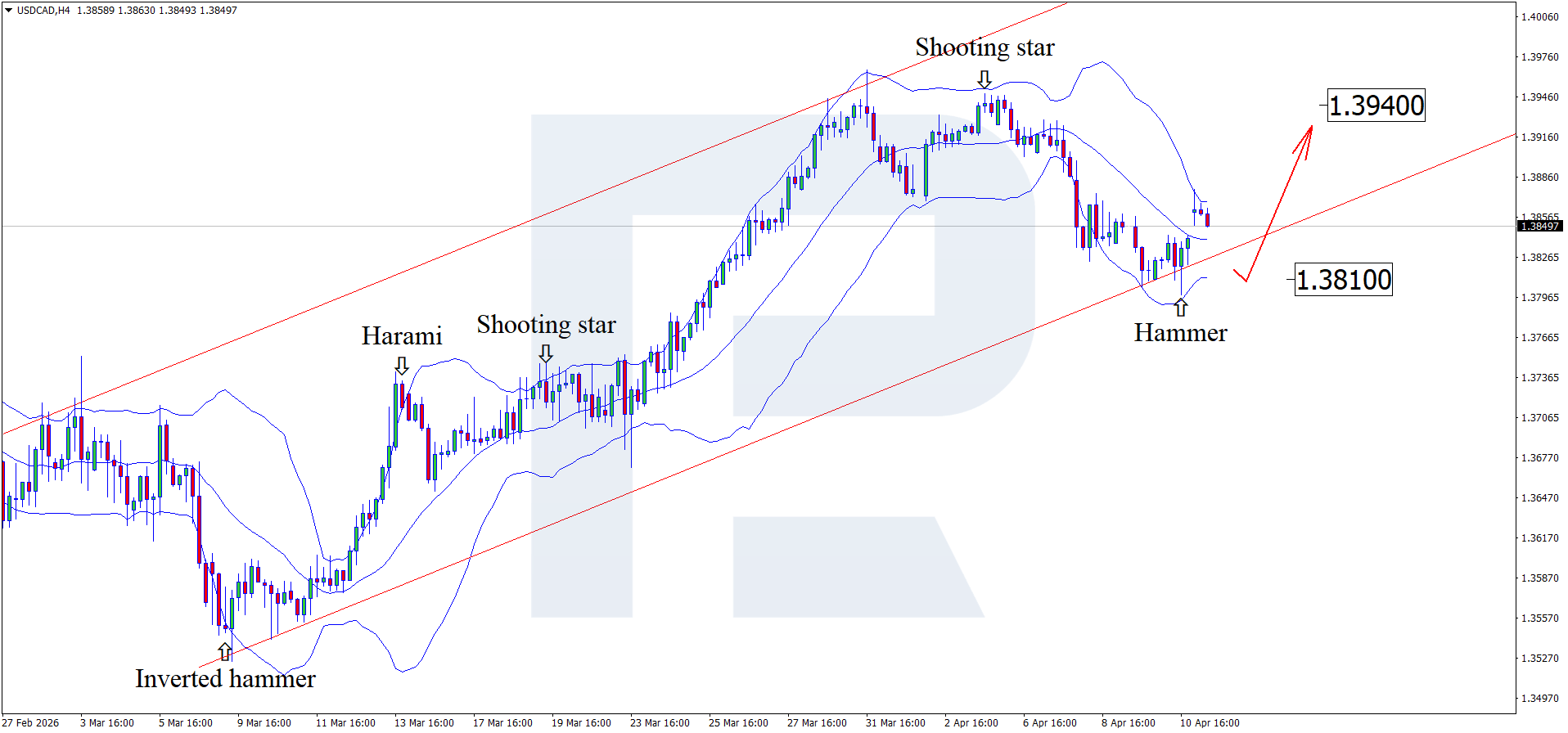 H4 grafikda USDCAD pastki Bollinger chizig‘i yaqinida Hammer qayrilish naqshini shakllantirdi. Hozirgi bosqichda, qaytishdan so‘ng, signal ishlashi davomida juftlik yuqoriga to‘lqinni qayta boshlashi mumkin. Narx o‘suvchi kanal ichida ushlab turgani bois, eng yaqin qarshilik — 1.3940 tomonga harakat ehtimoli yuqori. Undan yuqoriga yorilish trend davom etishi uchun yo‘l ochadi.