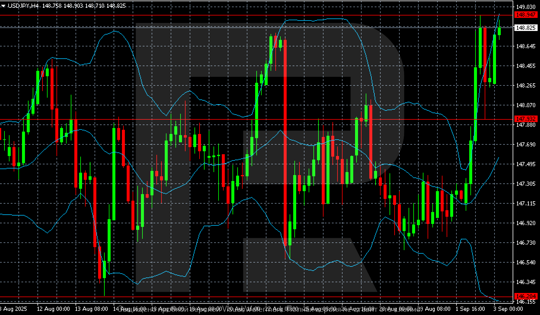 H4 grafikda USDJPY juftligi keng yonalish diapazonida harakatlanmoqda, biroq sentyabr boshida keskin ko‘tarilib, hozirda 148.80 atrofida, diapazonning yuqori chegarasiga yaqin savdo qilmoqda. Avgust oyida juftlik 147.30 qo‘llab-quvvatlash darajasini va 148.90 qarshilik darajasini bir necha bor test qildi va shu koridor ichida tebrandi.