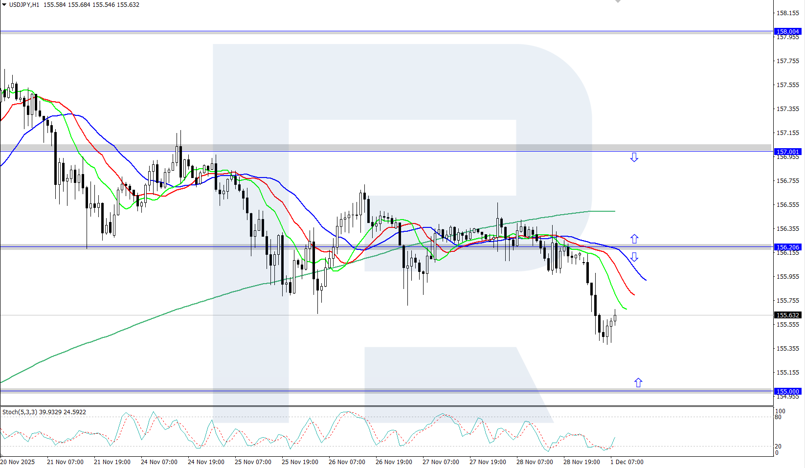 USDJPY ayirboshlash kursi mo‘tadil pasaymoqda, 156.00 dan pastga tushdi. Bu BoJning dekabr yig‘ilishida ehtimoliy stavka oshirishiga oid kutishlar fonida yuz bermoqda. Batafsil ma’lumotlar — 2025 yil 1 dekabr uchun tahlilimizda.