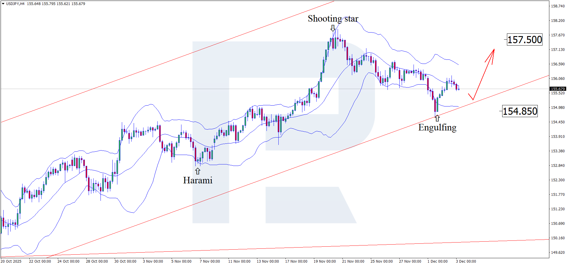 3 dekabr 2025 yil uchun prognoz USDJPY jufti korreksiya davomida 155.80 yaqinida savdo qilayotganini hisobga oladi.