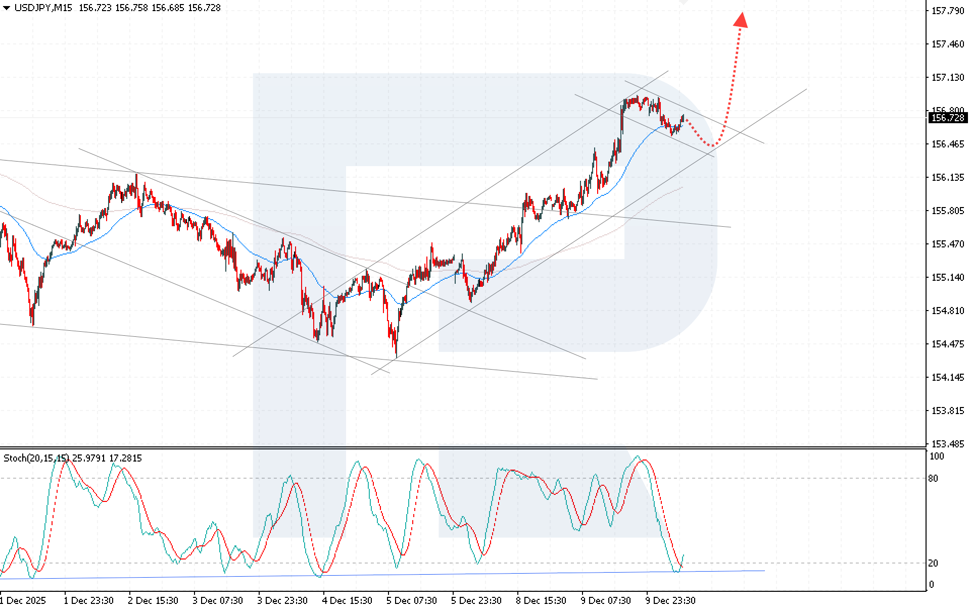 Bugungi USDJPY prognoziga ko‘ra, qisqa muddatli pasayish bosqichi yakunlanib, narx 157.80 darajasiga qarab o‘sishni davom ettirishi mumkin. Stoxastik osillatorda signal chiziqlarining haddan tashqari sotilgan hududdan yuqoriga burilishi ham yuqorilovchi ssenariyni tasdiqlaydi.