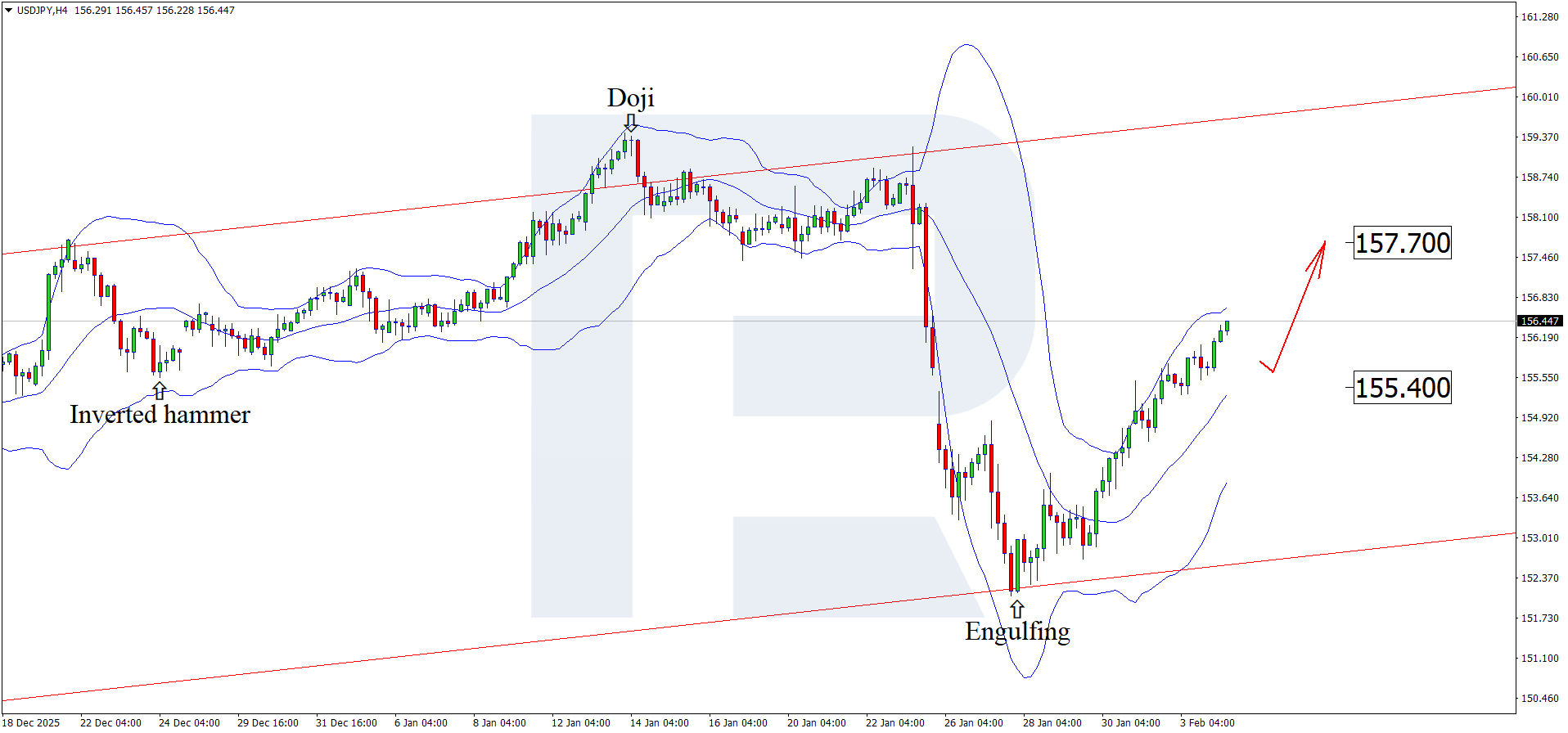 H4 grafikda USDJPY juftligi pastki Bollinger Band yaqinida Engulfing qaytish modelini shakllantirdi va 156.40 darajasi atrofida savdo qilinmoqda. Joriy bosqichda juftlik ushbu signal asosida o‘sishni davom ettirishi mumkin, yuqori maqsad 157.70 darajasida joylashgan.