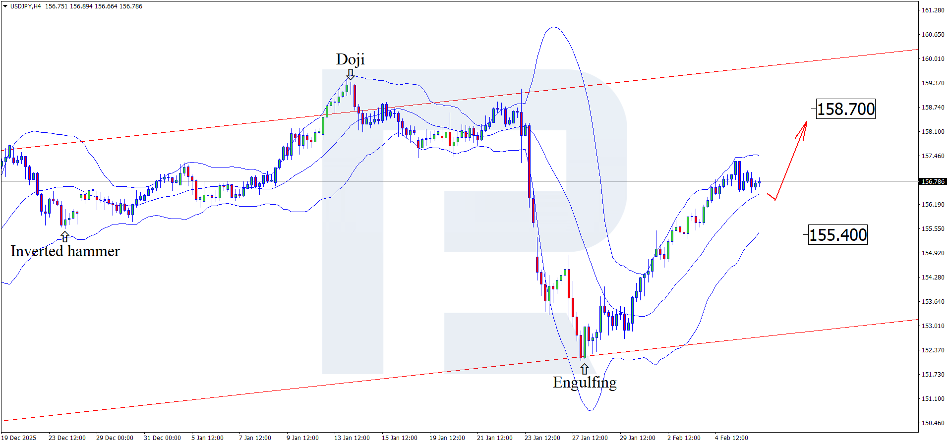 H4 grafikda USDJPY juftligi pastki Bollinger Band yaqinida Engulfing qaytish modelini shakllantirdi va hozirda 156.70 atrofida savdo qilinmoqda. Ushbu signal amalga oshishi bilan juftlik yuqoriga harakatni davom ettirishi mumkin, asosiy maqsad esa 158.70 darajasi hisoblanadi.