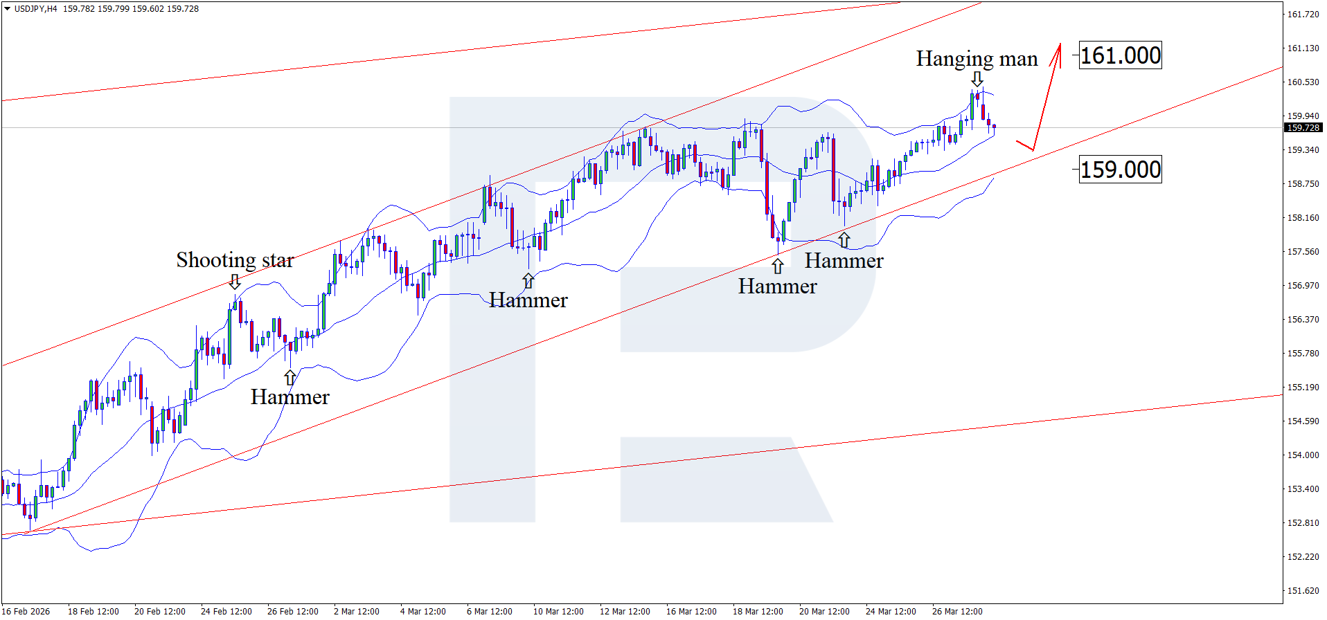 H4 grafikda USDJPY juftligi yuqori Bollinger Band yaqinida Shooting Star qaytish modelini shakllantirdi va 159.70 atrofida savdolanmoqda. Narx o‘suvchi kanal ichida qolayotgani sabab, model signali ortidan tuzatish harakatini davom ettirishi mumkin, tuzatish maqsadi esa 159.00.