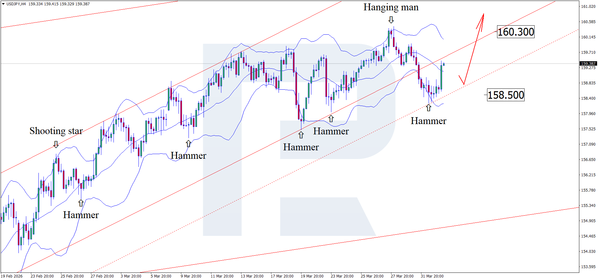 H4 grafikda USDJPY juftligi pastki Bollinger chizig‘i yaqinida Hammer qayrilish naqshini hosil qildi va 159.40 atrofida savdolanyapti. Narx o‘suvchi kanalning pastki chegarasini sinayotganligi sabab, qarshilik darajasidan yuqoriga yorib o‘tishi va naqsh signaliga muvofiq o‘sish traektoriyasini davom ettirishi mumkin; bu holatda yuqori maqsad 160.30.