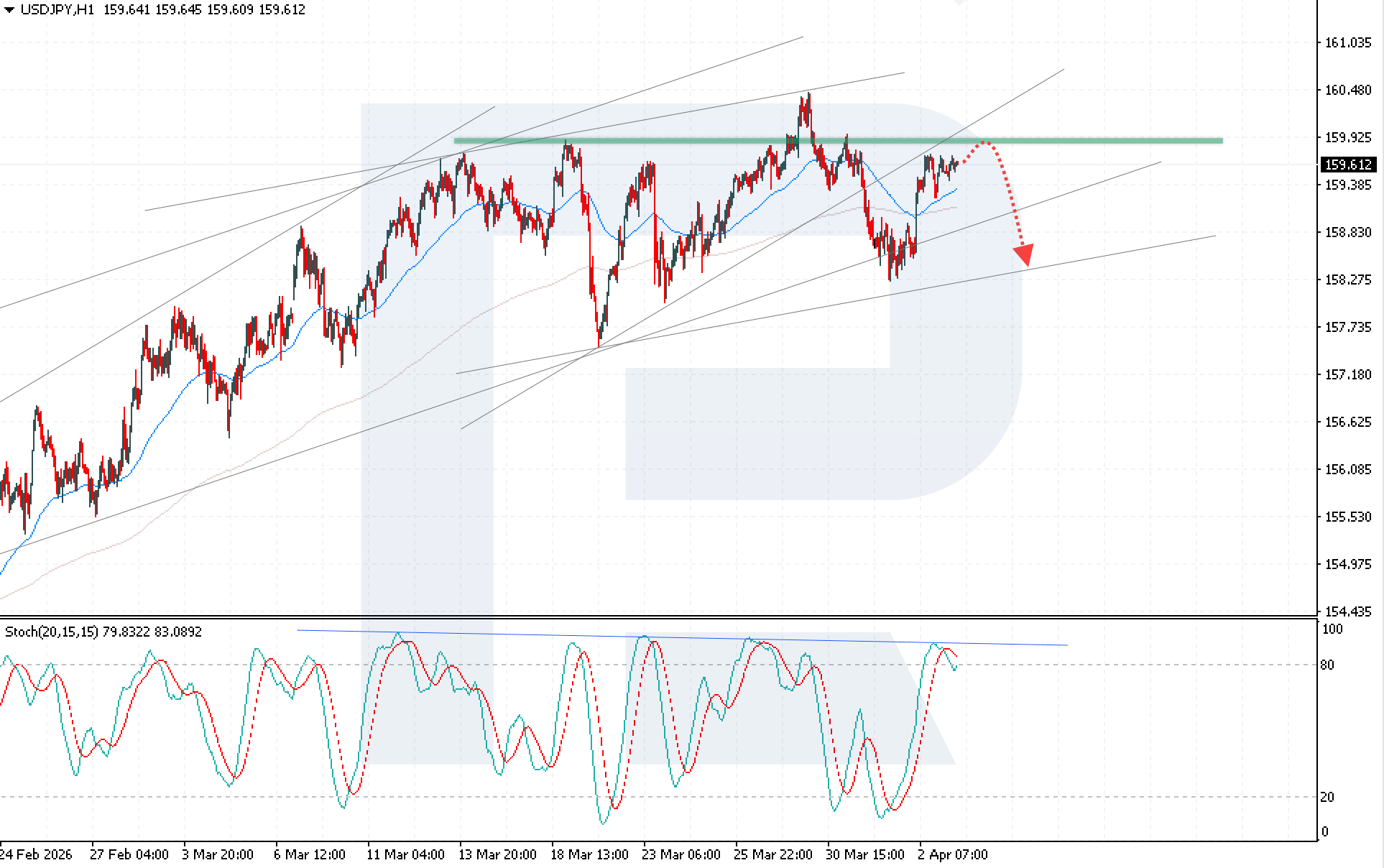Texnik manzara sotuvchilar tomoniga og‘moqda. Stochastic Oscillator pasayuvchi qarshilik chizig‘idan qaytmoqda, overbought hududida qolmoqda va bearish krossoverni shakllantirmoqda. Bu pastga harakat ehtimolini oshiradi. O‘suvchi kanalning pastki chegarasi buzilib, 158.70 dan pastda konsolidatsiya bo‘lsa, pasayish tasdiqlanadi va ko‘rsatilgan maqsadga yo‘l ochiladi.