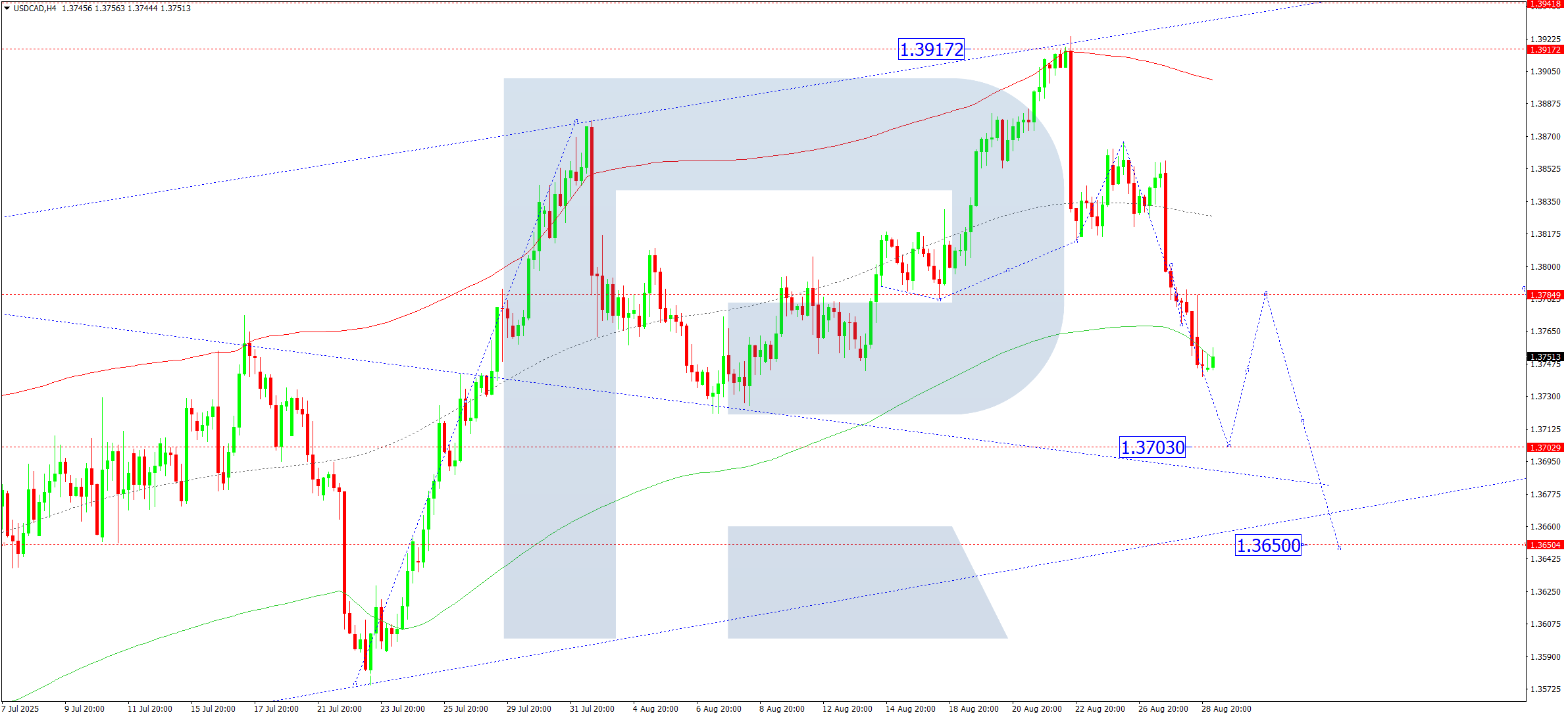 USDCAD ning H4 grafikida bozor 1.3780 ostiga tushib, 1.3700 gacha pasayish to‘lqinini davom ettirmoqda. Bugun, 29-avgust 2025-yilda, ushbu maqsadga yetishi kutilmoqda, keyin esa 1.3800 gacha tuzatish mumkin. Ushbu tuzatishdan so‘ng 1.3650 gacha yana bir pasayish to‘lqini yuz berishi mumkin.
