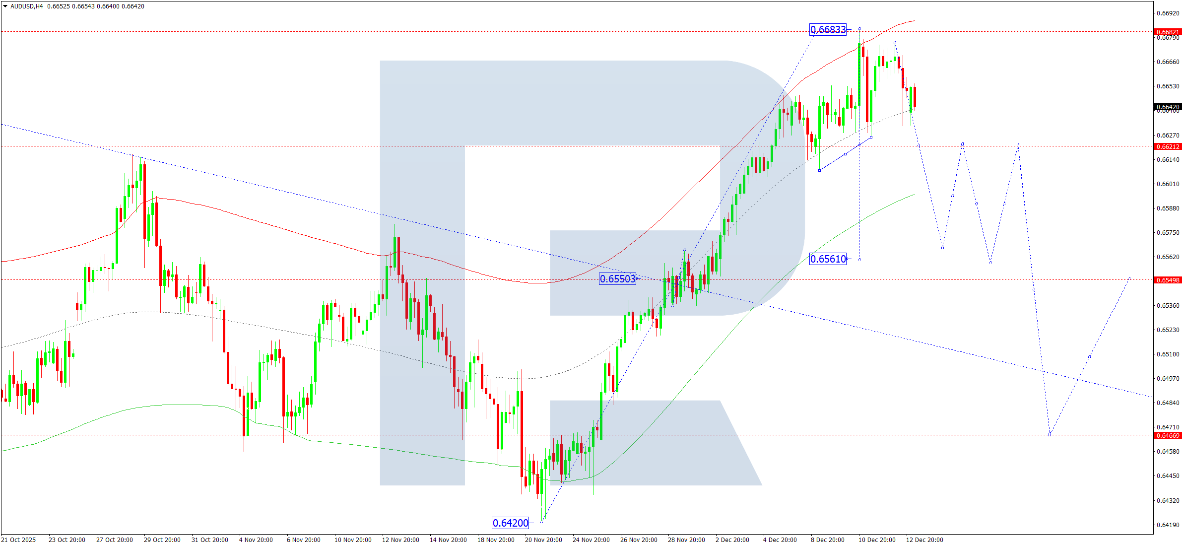 AUDUSD H4 grafikida bozor 0.6683 gacha o‘suvchi to‘lqinni yakunladi. Bugun, 15 dekabr 2025, 0.6622 tomonga (yuqoridan sinov) pasayuvchi harakat boshlanishini kutyapmiz. Keyin tuzatishning 0.6555 tomonga kengayishi ehtimolini ko‘rib chiqamiz. Agar narx ushbu darajani buzib o‘tsa, bu 0.6561 tomonga pasayuvchi to‘lqinning davom etish imkoniyatini ochadi.