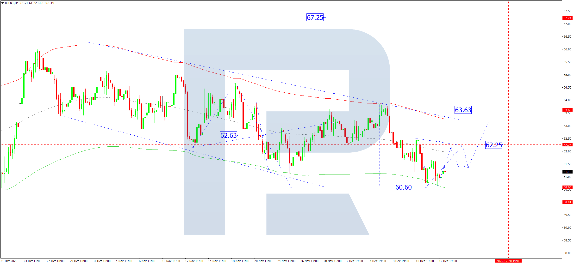 Brent xom neftining H4 grafikida bozor 60.60 gacha pasayuvchi to‘lqinni yakunladi. Bugun, 15 dekabr 2025, ushbu daraja ustida yangi konsolidatsiya diapazonining rivojlanishini kutyapmiz. Agar narx yuqoriga yorilsa, 62.62 tomonga o‘suvchi to‘lqinning boshlanish imkoniyati ochiladi. Ushbu darajadan yuqoriga yorilish trendning 63.63 tomonga davom etish imkoniyatini ochadi.
