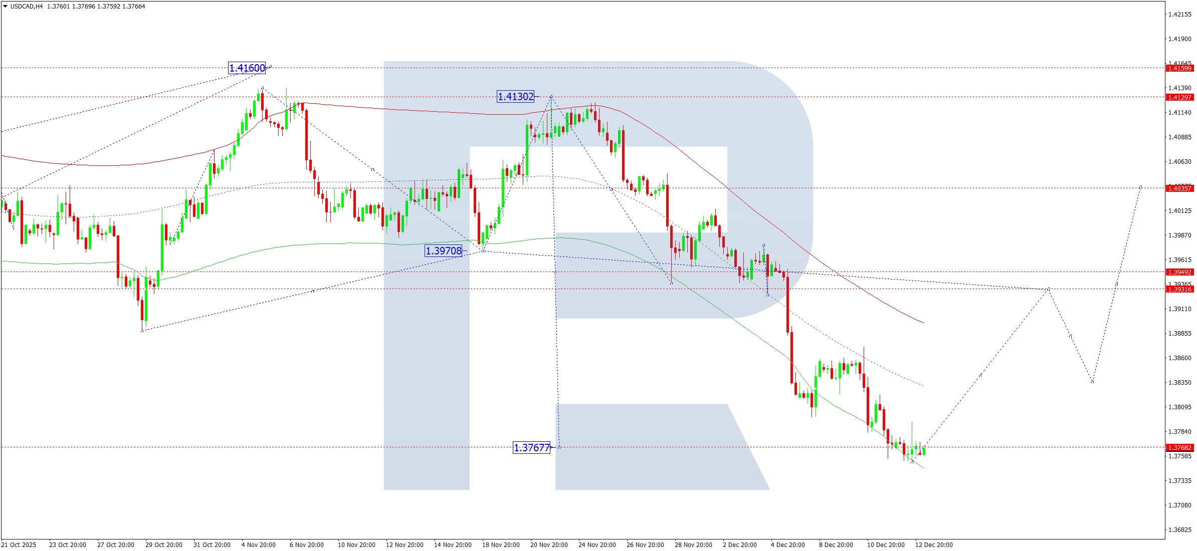 USDCAD H4 grafikida bozor 1.3767 gacha pasayuvchi to‘lqinni yakunladi. Bugun, 15 dekabr 2025, ushbu daraja ustida ixcham konsolidatsiya diapazoni shakllandi. Biz 1.3939 tomonga yuqoriga yorilishni kutyapmiz. Keyinroq tuzatishning 1.3844 tomonga kengayish ehtimolini ko‘rib chiqamiz. Ushbu tuzatish tugagach, 1.4040 tomonga yangi o‘suvchi to‘lqinning boshlanishini ko‘rib chiqamiz. Bu maqsad mahalliy bo‘lib qoladi.