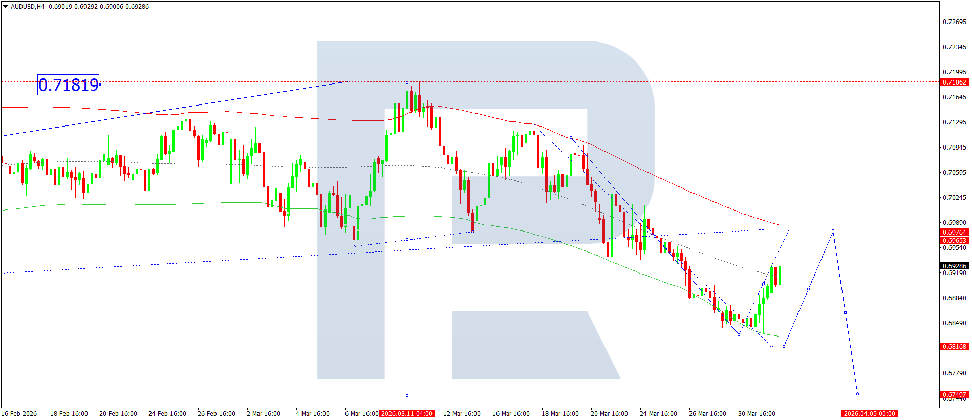 AUDUSD juftligining H4 grafikida bozor 0.6868 atrofida konsolidatsiya diapazonini shakllantirdi va yuqoriga yorib o‘tdi. Bugun, 1 aprel 2026, 0.6950 tomon tuzatish o‘sish to‘lqini rivojlanishi kutilmoqda. Shundan so‘ng 0.6816 gacha pasayish kutiladi. Bu lokal maqsad hisoblanadi.