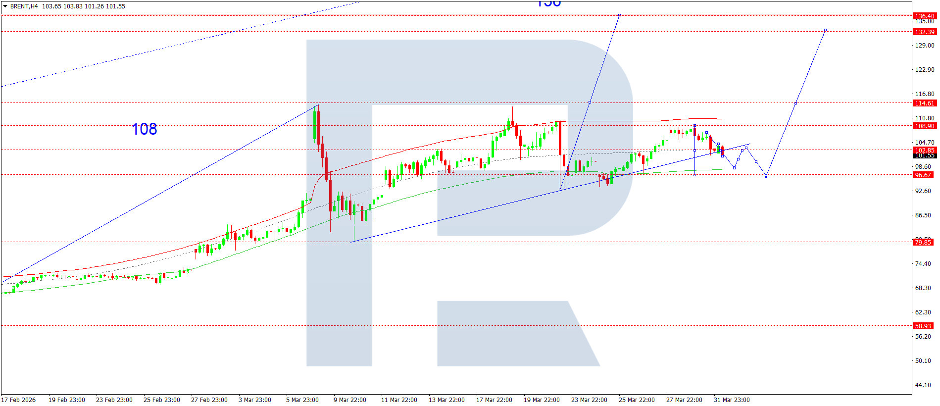 Brent xom neftining H4 grafikida bozor 108.88 gacha o‘sish to‘lqinini yakunladi. Bugun, 1 aprel 2026, ushbu darajadan pastda konsolidatsiya diapazoni shakllanishi ko‘rib chiqilmoqda. Agar yuqoriga yorib o‘tilsa, 114.60 gacha o‘sish uchun imkoniyat ochiladi va trend 136.40 gacha davom etishi mumkin. Bu lokal maqsad hisoblanadi. Agar pastga yorib o‘tilsa, 97.00 gacha tuzatish ehtimoli mavjud, undan keyin yana 114.60 tomon o‘sish kutiladi.