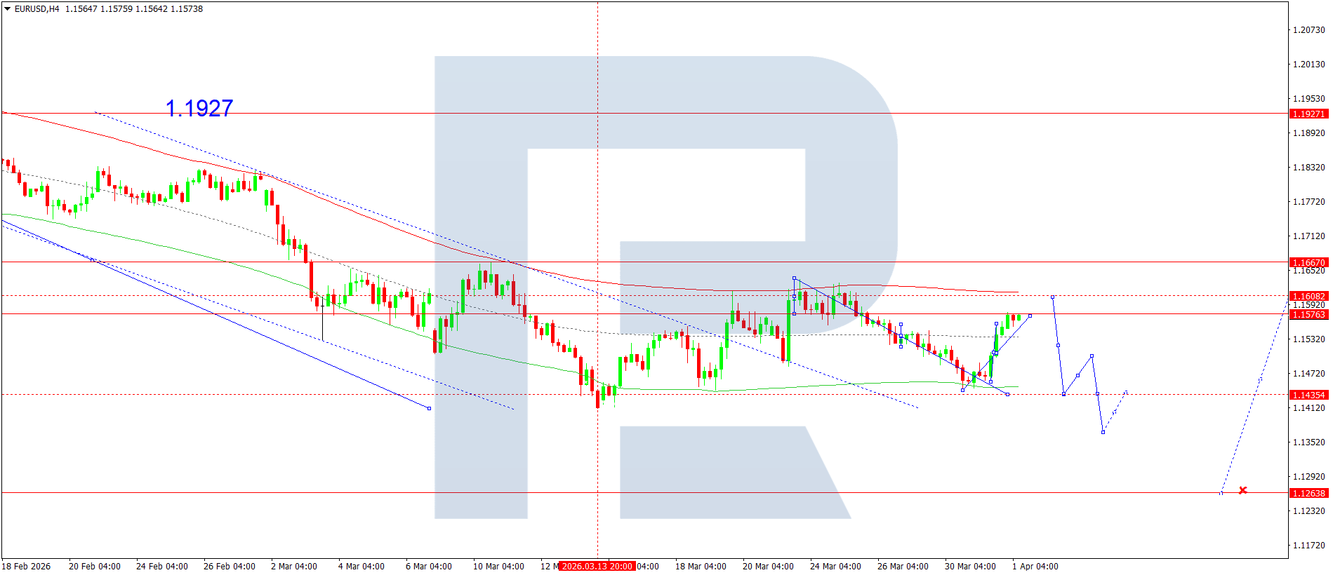 EURUSD juftligining H4 grafikida bozor 1.1443 gacha pasayish to‘lqinini yakunladi va 1.1576 gacha tuzatish amalga oshirdi. Bugun, 1 aprel 2026, ushbu daraja atrofida konsolidatsiya diapazoni shakllanishi kutilmoqda. Agar yuqoriga yorib o‘tilsa, 1.1600 tomon tuzatishning davom etishi uchun imkoniyat ochiladi. Agar pastga yorib o‘tilsa, pasayish to‘lqini 1.1434 gacha davom etishi mumkin, shuningdek trend 1.1360 gacha kengayishi ehtimoli mavjud.