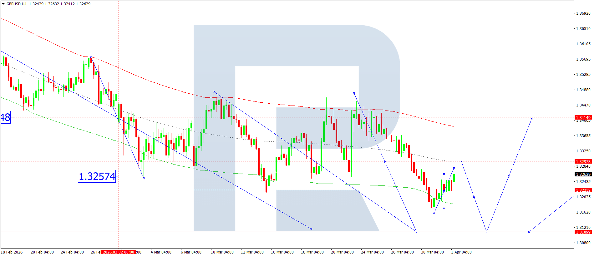 GBPUSD juftligining H4 grafikida bozor 1.3158 gacha pasayish to‘lqinini shakllantirdi va 1.3280 gacha tuzatish amalga oshirdi. Bugun, 1 aprel 2026, ushbu darajadan pastda konsolidatsiya diapazoni rivojlanishi kutilmoqda. Agar pastga yorib o‘tilsa, 1.3100 gacha pasayish uchun imkoniyat ochiladi. Agar yuqoriga yorib o‘tilsa, 1.3298 tomon harakat uchun imkoniyat paydo bo‘ladi. Ushbu darajaga yetgach, narx 1.3000 gacha pasayishi mumkin. Bu lokal maqsad hisoblanadi.