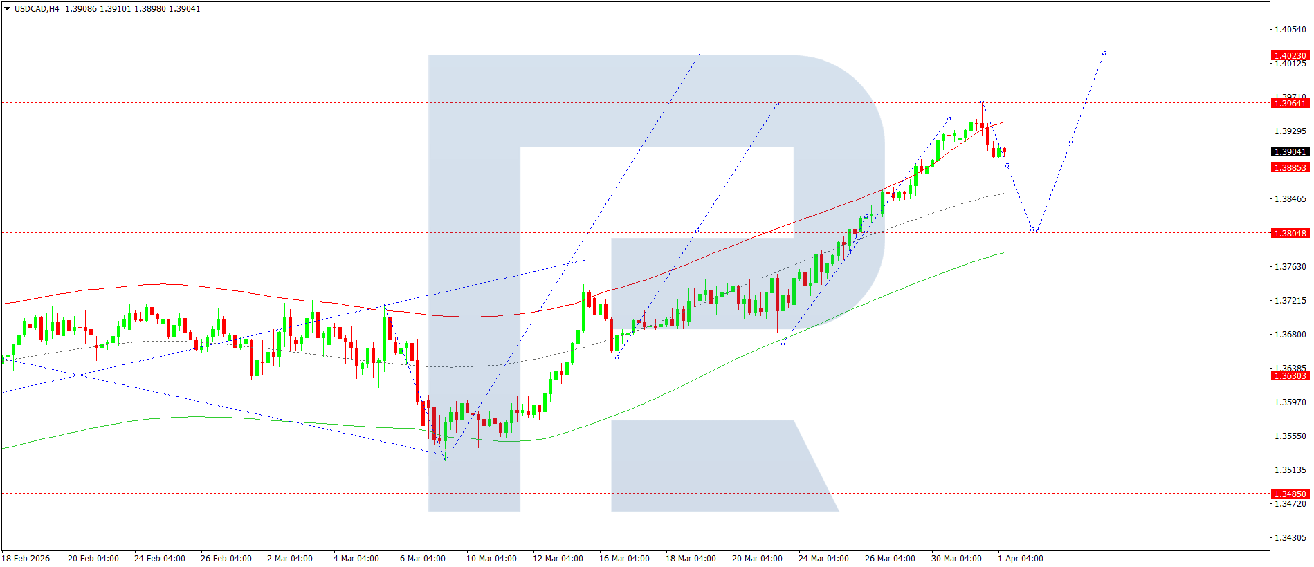 USDCAD juftligining H4 grafikida bozor 1.3961 gacha o‘sish to‘lqinini yakunladi. Bugun, 1 aprel 2026, 1.3800 gacha tuzatish ehtimoli mavjud. Shundan so‘ng 1.4020 gacha o‘sish kutilmoqda.