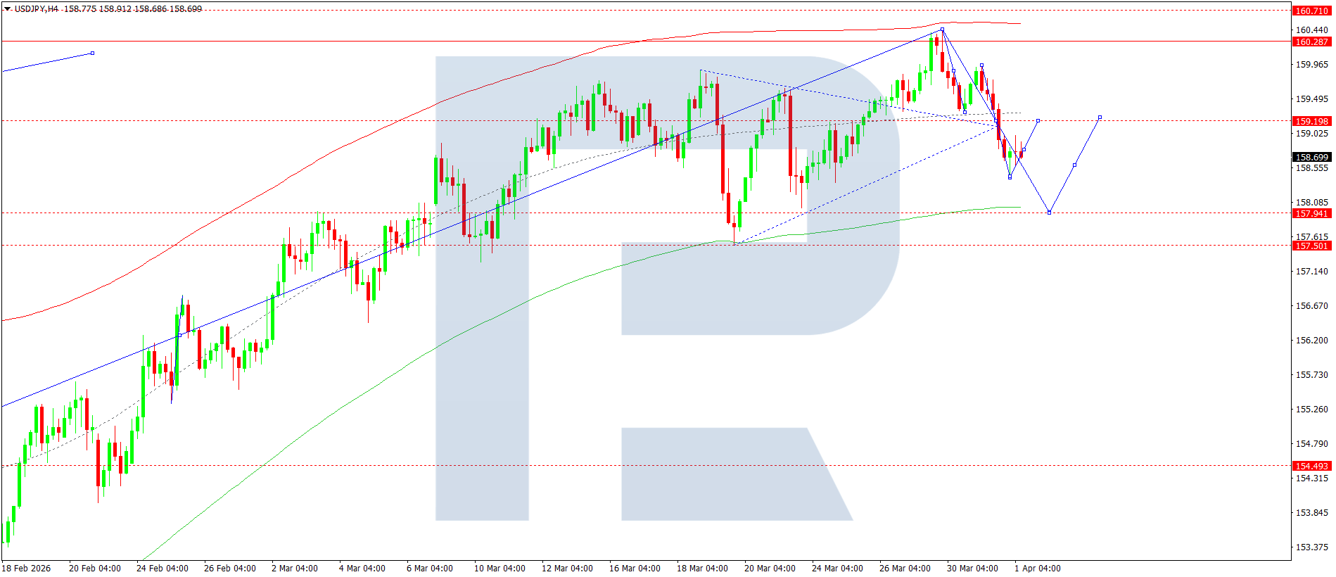 USDJPY juftligining H4 grafikida bozor 158.46 gacha pasayish tuzilmasini yakunladi va 159.00 gacha tuzatish (pastdan qayta test) amalga oshirdi. Bugun, 1 aprel 2026, 159.19 daraja atrofida konsolidatsiya diapazoni shakllangan. Agar yuqoriga yorib o‘tilsa, 160.70 tomon to‘lqin uchun imkoniyat ochiladi. Agar pastga yorib o‘tilsa, 158.00 tomon tuzatish to‘lqini ko‘rib chiqiladi.