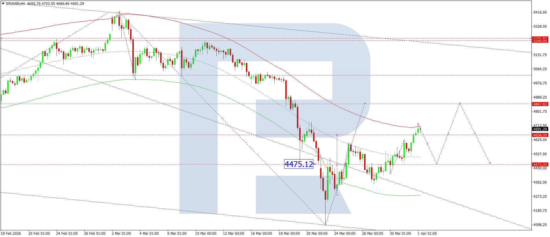 XAUUSD H4 grafikida bozor 4500 dan yuqoriga yorib o‘tdi va 4747 tomon o‘sish to‘lqinini davom ettirmoqda. Bugun, 1 aprel 2026, ushbu darajaga yetish kutilmoqda. Shundan so‘ng ushbu darajadan yuqorida konsolidatsiya diapazoni shakllanishi mumkin. Agar yuqoriga yorib o‘tilsa, 4848 gacha o‘sish uchun imkoniyat ochiladi va trend 4855 gacha davom etishi mumkin. Muqobil ssenariy sifatida, agar pastga yorib o‘tilsa, 4550 gacha yana bir pasayish ehtimoli mavjud. Bu lokal maqsad hisoblanadi.
