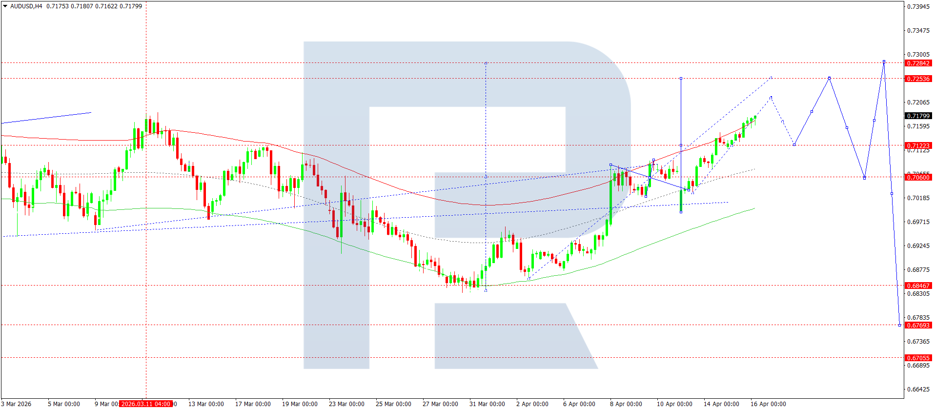 AUDUSD juftligining H4 grafikida bozor 0.7122 atrofida konsolidatsiya hosil qilib, yuqoriga yorib o‘tib 0.7190 darajasiga yetdi. Bugun, 16 aprel 2026, o‘sish 0.7216 gacha davom etishi kutilmoqda. Agar ushbu daraja yorib o‘tilsa, 0.7282 gacha o‘sish ehtimoli ochiladi.