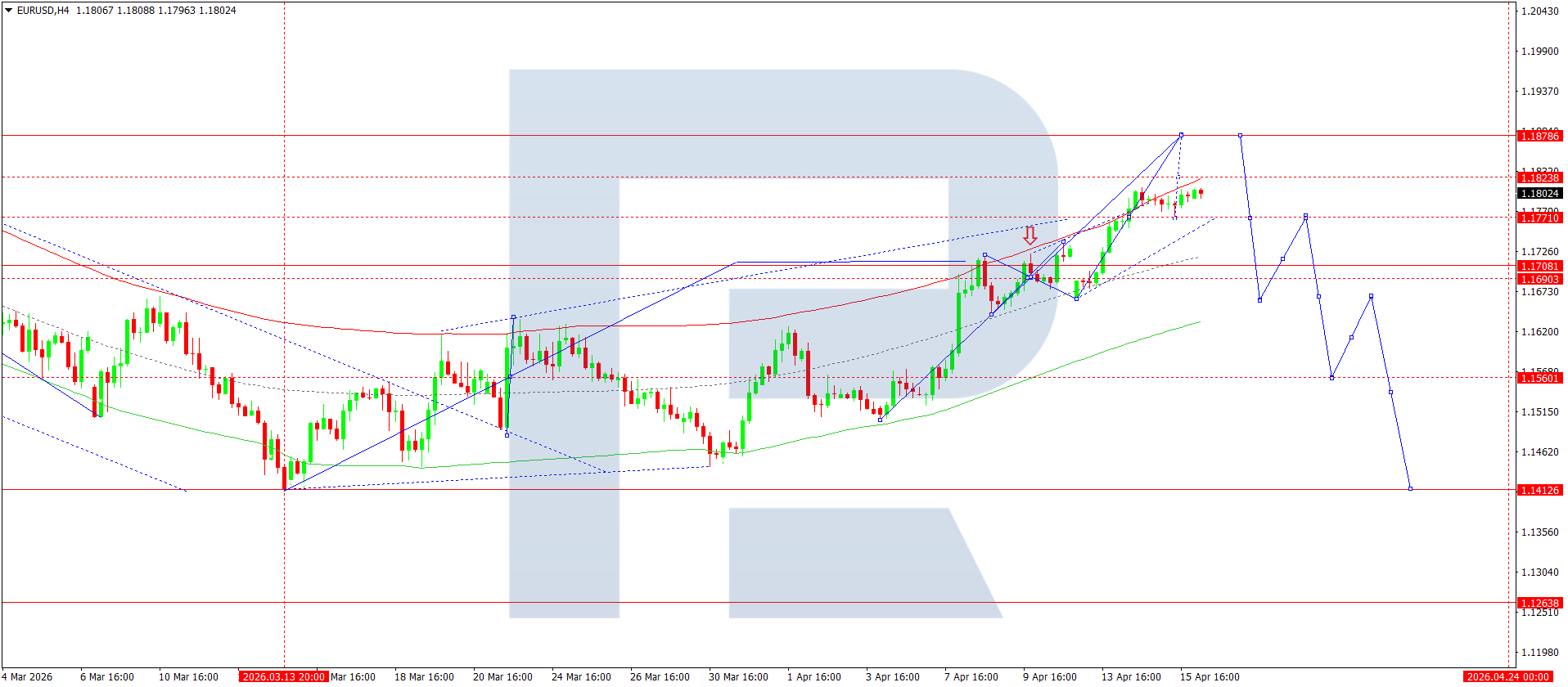 EURUSD juftligining H4 grafikida bozor 1.1770 atrofida konsolidatsiya diapazonini shakllantirdi. Bugun, 16 aprel 2026, 1.1828 gacha o‘sish kutilmoqda, keyinchalik trend 1.1878 gacha davom etishi mumkin. Shundan so‘ng 1.1700 gacha pasayish to‘lqini boshlanishi ehtimoli mavjud.