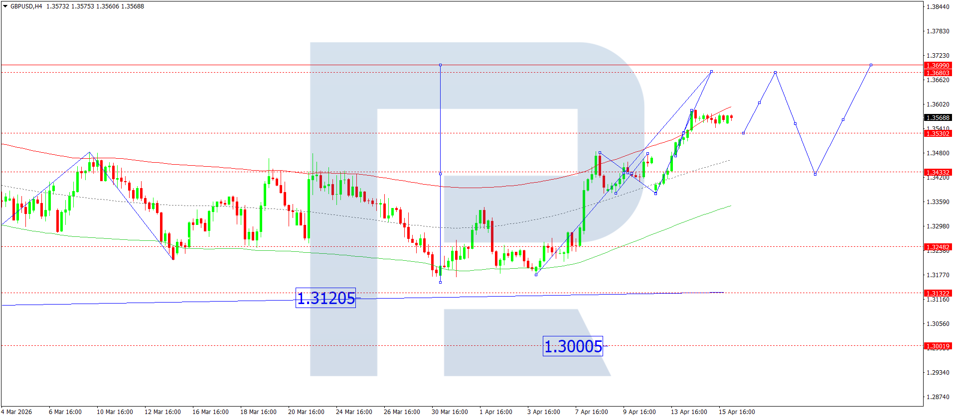GBPUSD juftligining H4 grafikida bozor 1.3530 atrofida konsolidatsiya diapazonini davom ettirmoqda. Bugun, 16 aprel 2026, narx yuqoriga yorib o‘tishi kutilmoqda va bu 1.3680 hamda 1.3690 gacha o‘sish imkonini beradi.