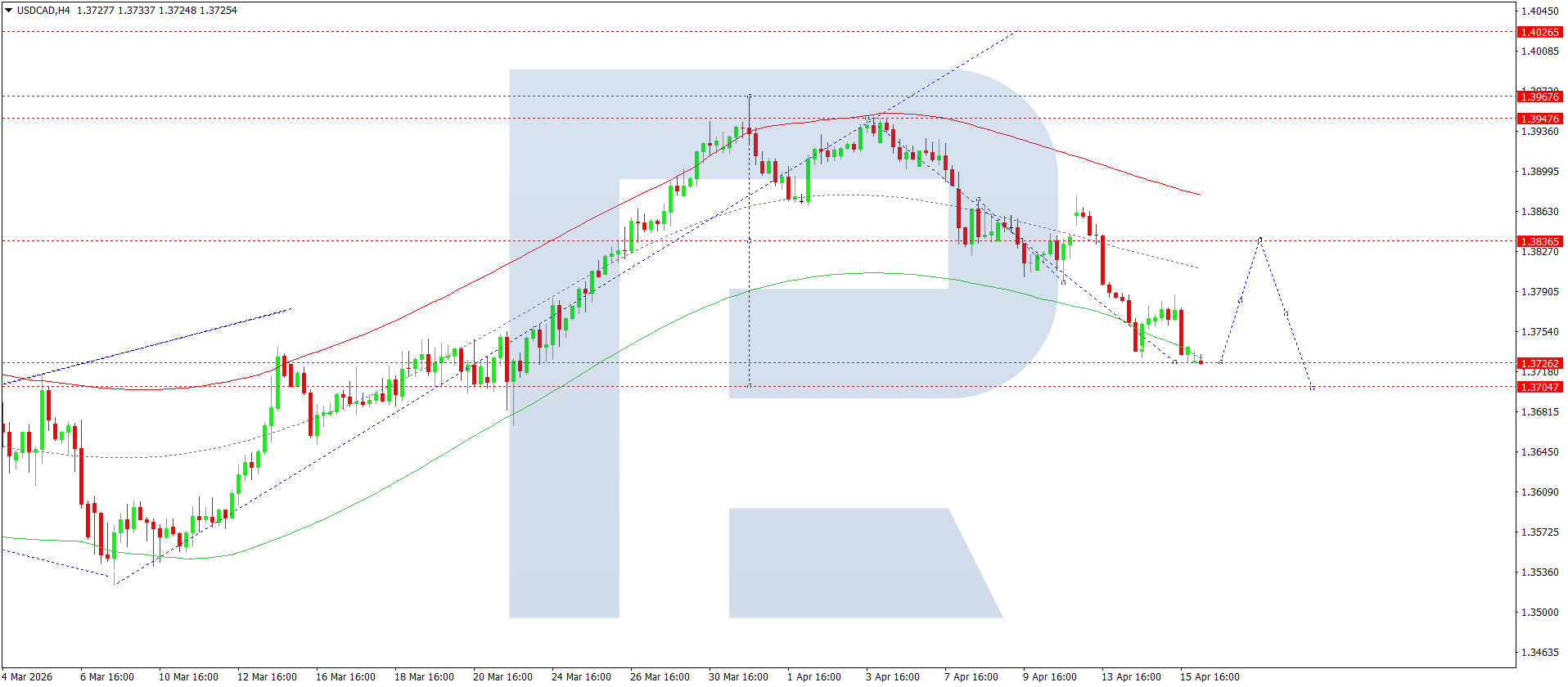 USDCAD juftligining H4 grafikida bozor 1.3712 darajasigacha pasayish strukturasini yakunladi. Bugun, 16 aprel 2026, ushbu darajadan yuqorida konsolidatsiya kutilmoqda. Agar pastga yorib o‘tilsa, 1.3700 gacha pasayish mumkin. Agar yuqoriga yorib o‘tilsa, 1.3865 va 1.4025 gacha o‘sish ehtimoli mavjud.