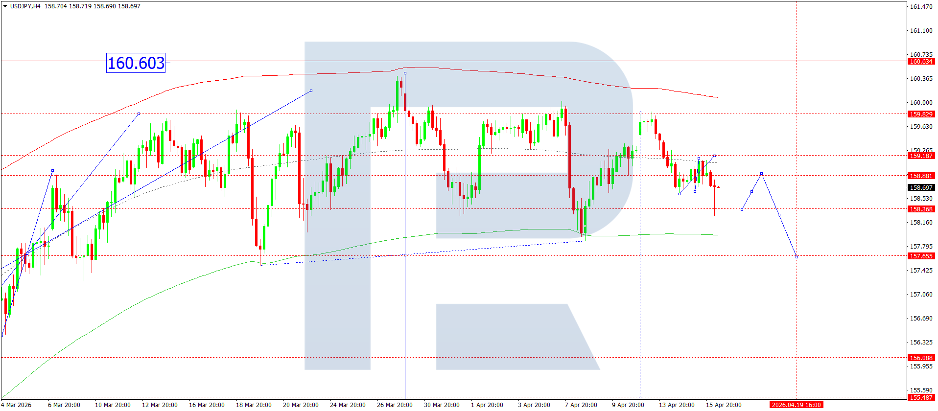 USDJPY juftligining H4 grafikida bozor 158.38 darajasigacha pasayish to‘lqinini yakunladi. Bugun, 16 aprel 2026, 158.88 gacha o‘sish to‘lqini rivojlanmoqda. Keyinchalik 157.65 gacha pasayish ehtimoli mavjud va bu harakat 156.00 gacha davom etishi mumkin.