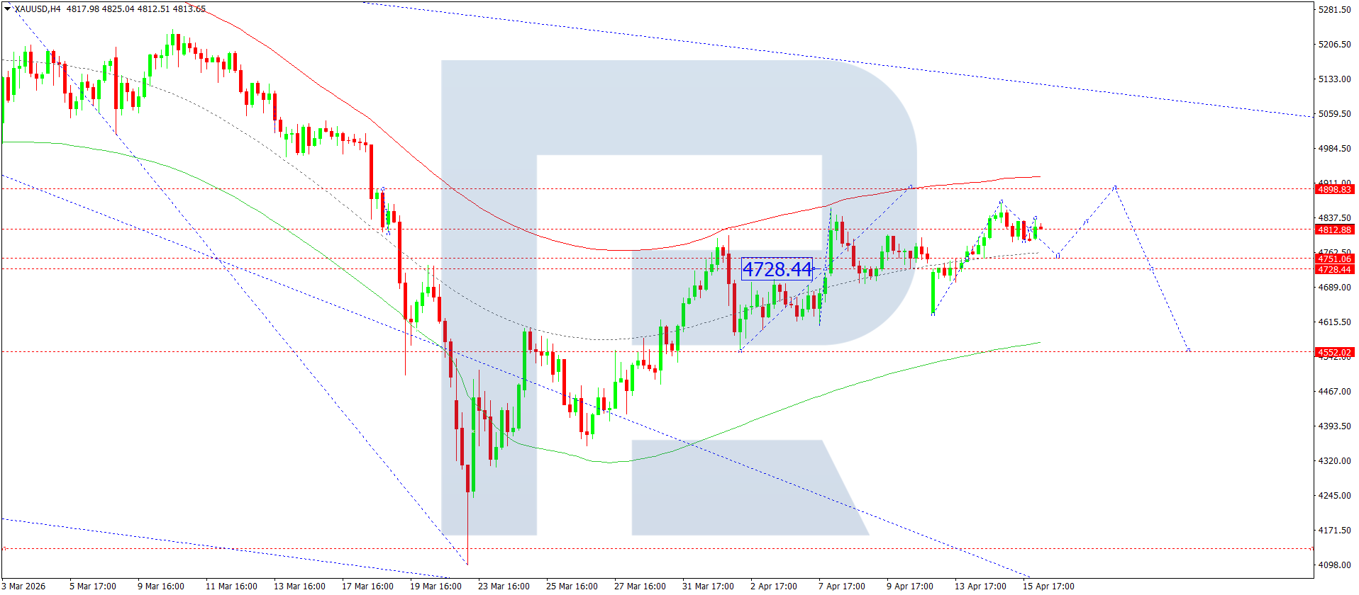 XAUUSD H4 grafikida bozor 4,812 atrofida konsolidatsiya shakllantirmoqda. Bugun, 16 aprel 2026, narxlar 4,755 gacha pasayib, keyin 4,898 gacha ko‘tarilishi kutilmoqda. 4,750 atrofida konsolidatsiya shakllanmoqda. Agar yuqoriga yorib o‘tilsa, 5,050 va 5,065 gacha o‘sish ehtimoli mavjud. Aks holda, pastga yorib o‘tilsa, 4,555 gacha pasayish mumkin.